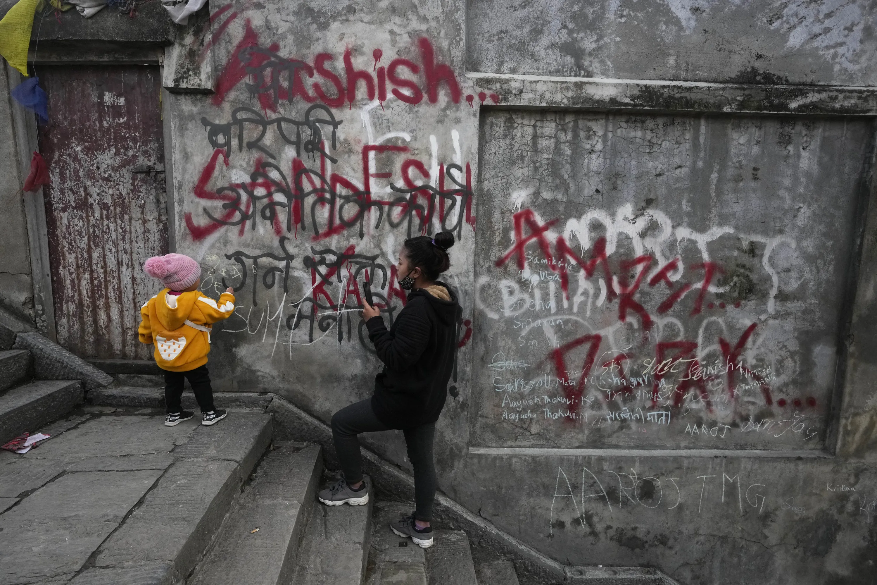 A Nepalese woman takes a photo of her child writing her name on the wall of a Saraswati temple, which has already been vandalized by unidentified people during Shri Panchami festival in Kathmandu, Nepal, Sunday, February 6, 2022. (Photo by Niranjan Shrestha/AP Photo)