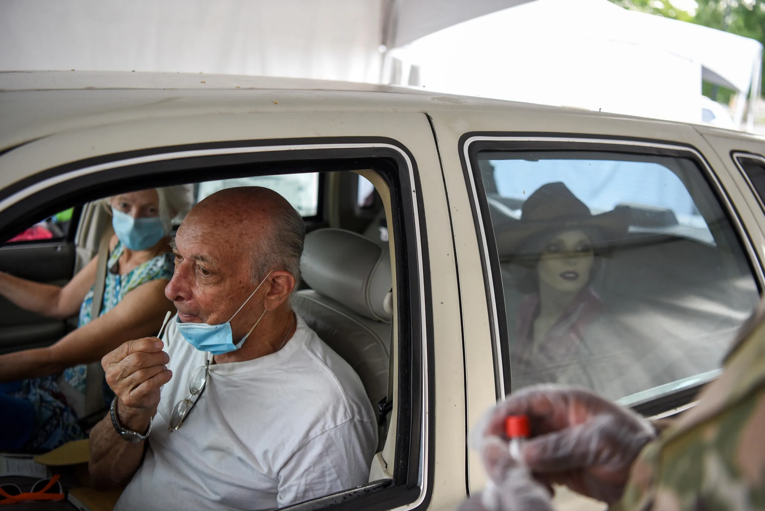 A person uses a nasal swab to provide a sample to be tested for the coronavirus disease (COVID-19) at a drive-thru testing site as cases surge across the state, in New Orleans, Louisiana, U.S., August 6, 2021. (Photo by Callaghan O'Hare/Reuters)