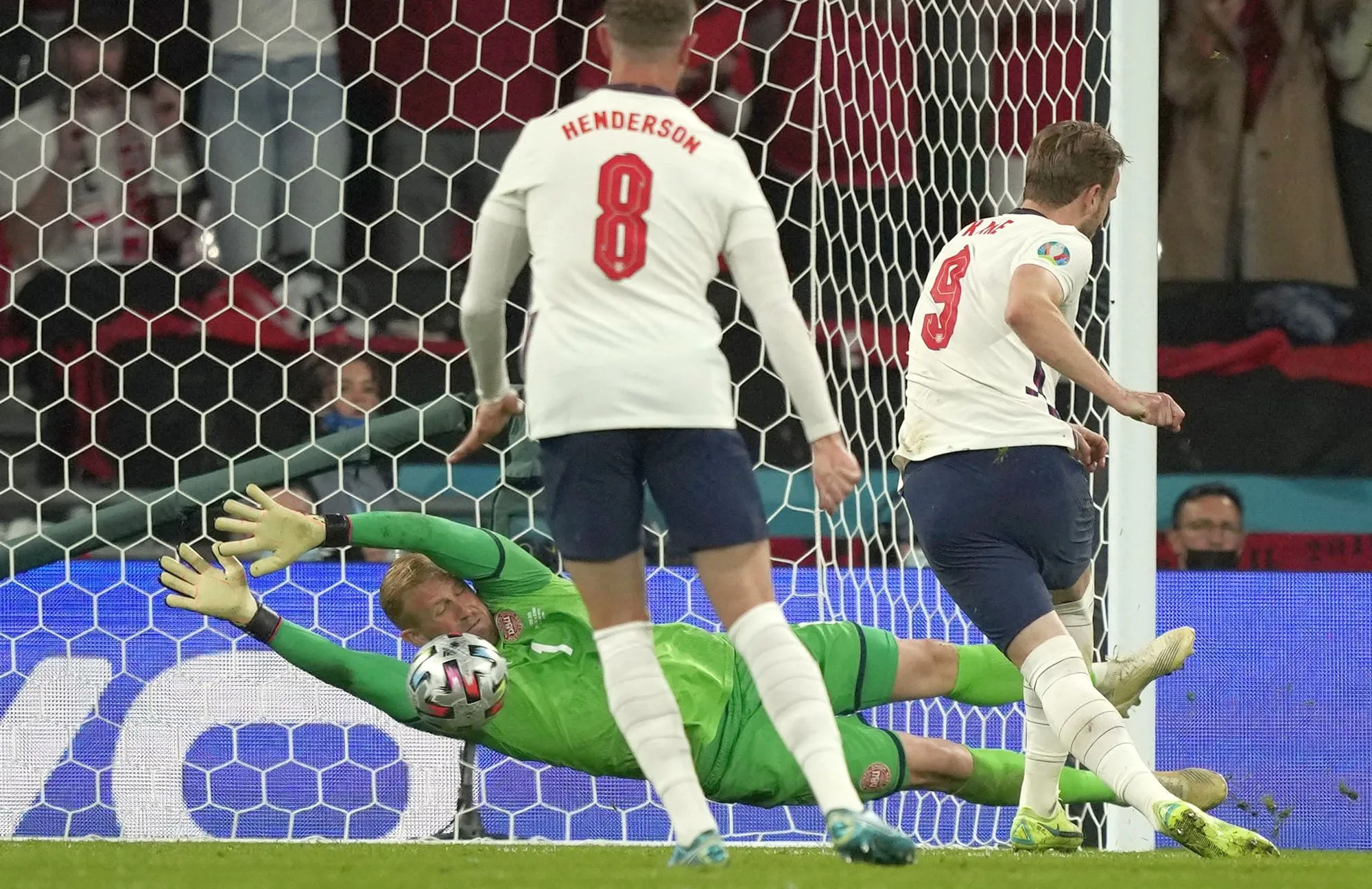 England's forward Harry Kane (R) shoots and scores a penalty kick past Denmark's goalkeeper Kasper Schmeichel (Back) during the UEFA EURO 2020 semi-final football match between England and Denmark at Wembley Stadium in London on July 7, 2021. (Photo by Frank Augstein/Pool via AFP Photo)