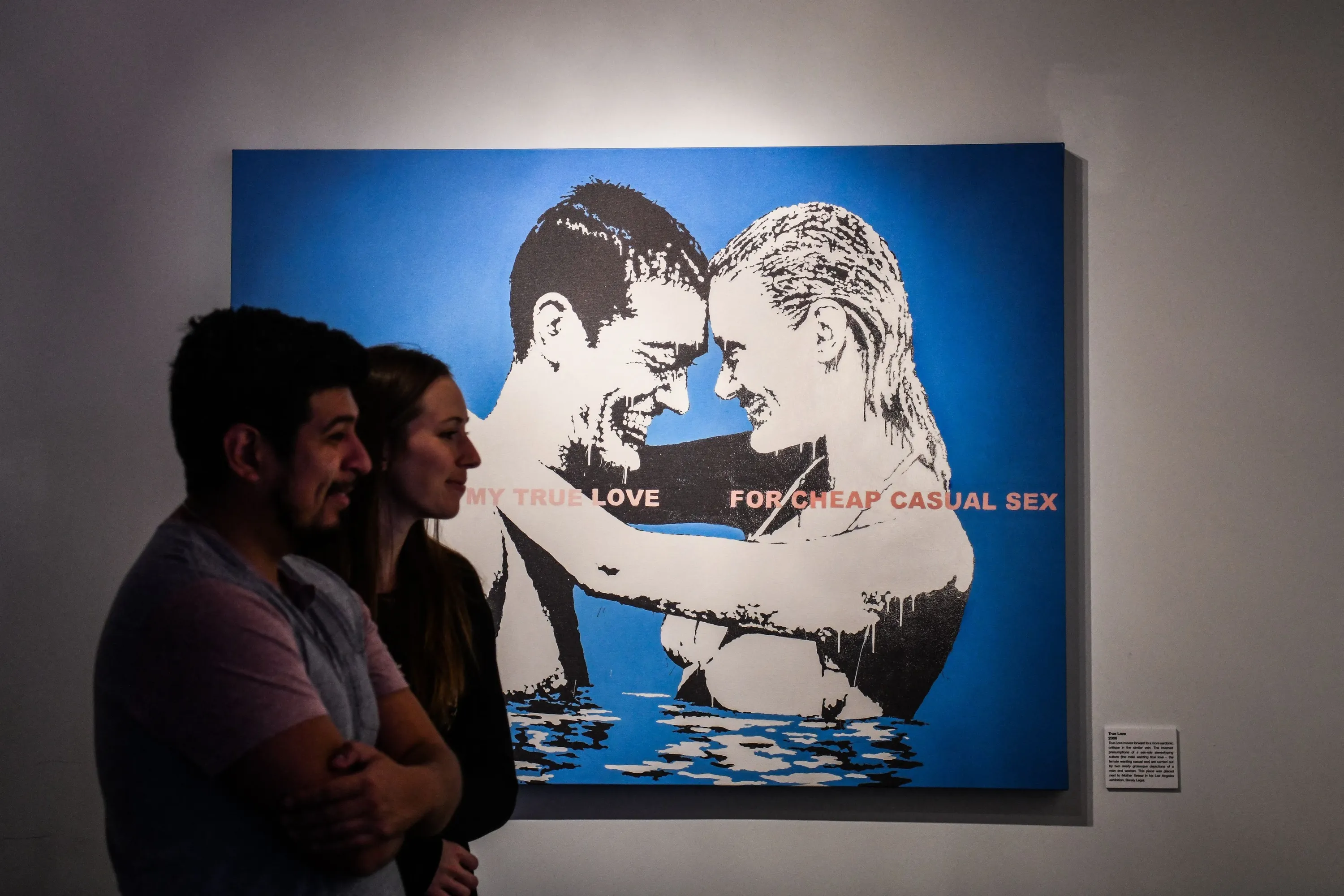 People look at works by British artist Banksy displayed during the exhibition “The Art of Banksy: Without Limits” in Miami, Florida on February 2, 2022. (Photo by Chandan Khanna/AFP Photo)