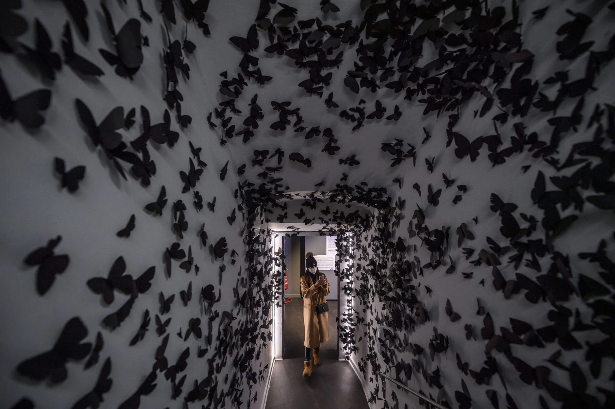 A visitor looks at the “Black Cloud Fashion” by artist Carlos Amorales, as part of the “Crazy: Madness In Contemporary” Art exhibition, at Chiostro del Bramante, on February 19, 2022 in Rome, Italy. The exhibition project titled “Crazy: La Follia nel Arte Contemporanea”, curated by Danilo Eccher is scheduled from February 19, 2022 to March 8, 2023. (Photo by Antonio Masiello/Getty Images)