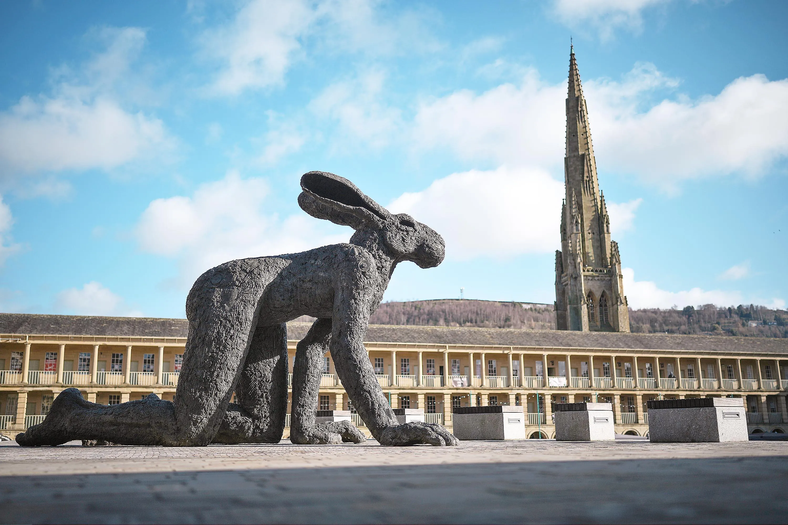 “Crawling Lady-Hare” by British sculptor Sophie Ryder is displayed in the courtyard of the historic Piece Hall on February 10, 2022 in Halifax, England. “Dances Hares” has never been exhibited publicly in the UK before and forms the centre piece of Ryder's exhibition of monumental art. The sculptures are on display until 23 May where they can be viewed by the public free of charge. (Photo by Christopher Furlong/Getty Images)