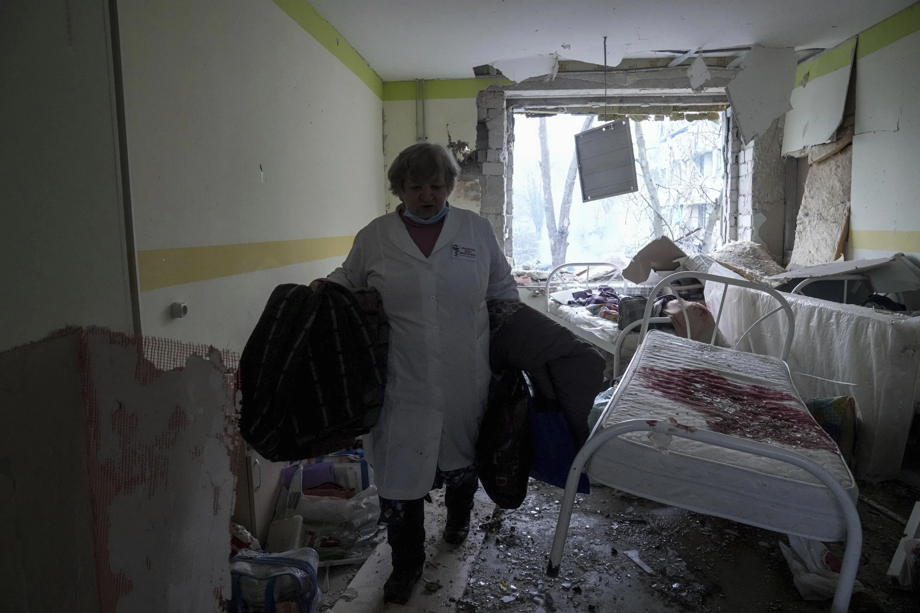A medical worker walks inside of the damaged by shelling maternity hospital in Mariupol, Ukraine, Wednesday, March 9, 2022. A Russian attack has severely damaged a maternity hospital in the besieged port city of Mariupol, Ukrainian officials say. (Photo by Evgeniy Maloletka/AP Photo)