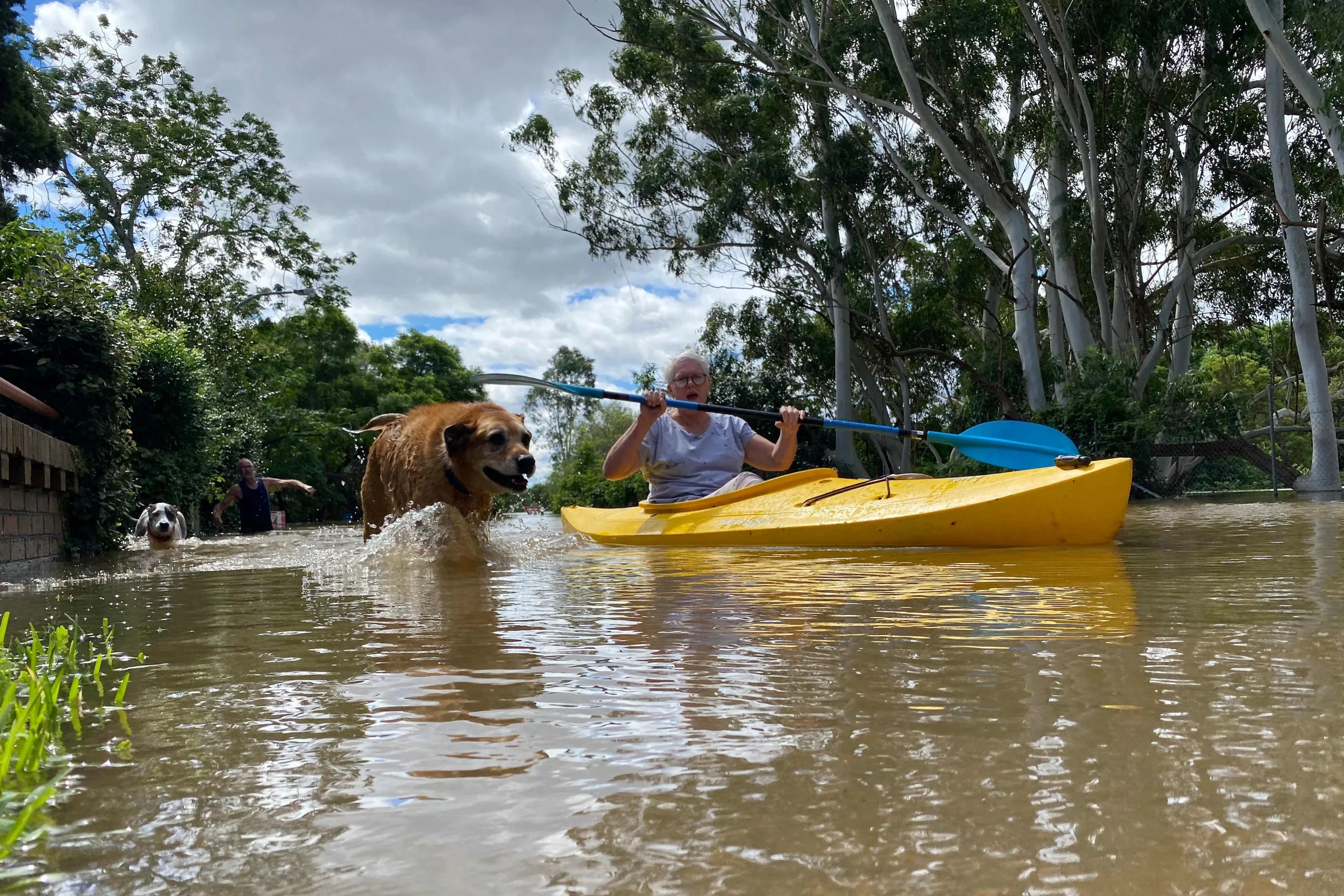 A woman kayaks with her dog to move around her flooded neighbourhood in the Windsor suburb of Sydney on March 9, 2022. (Photo by Muhammad Farooq/AFP Photo)