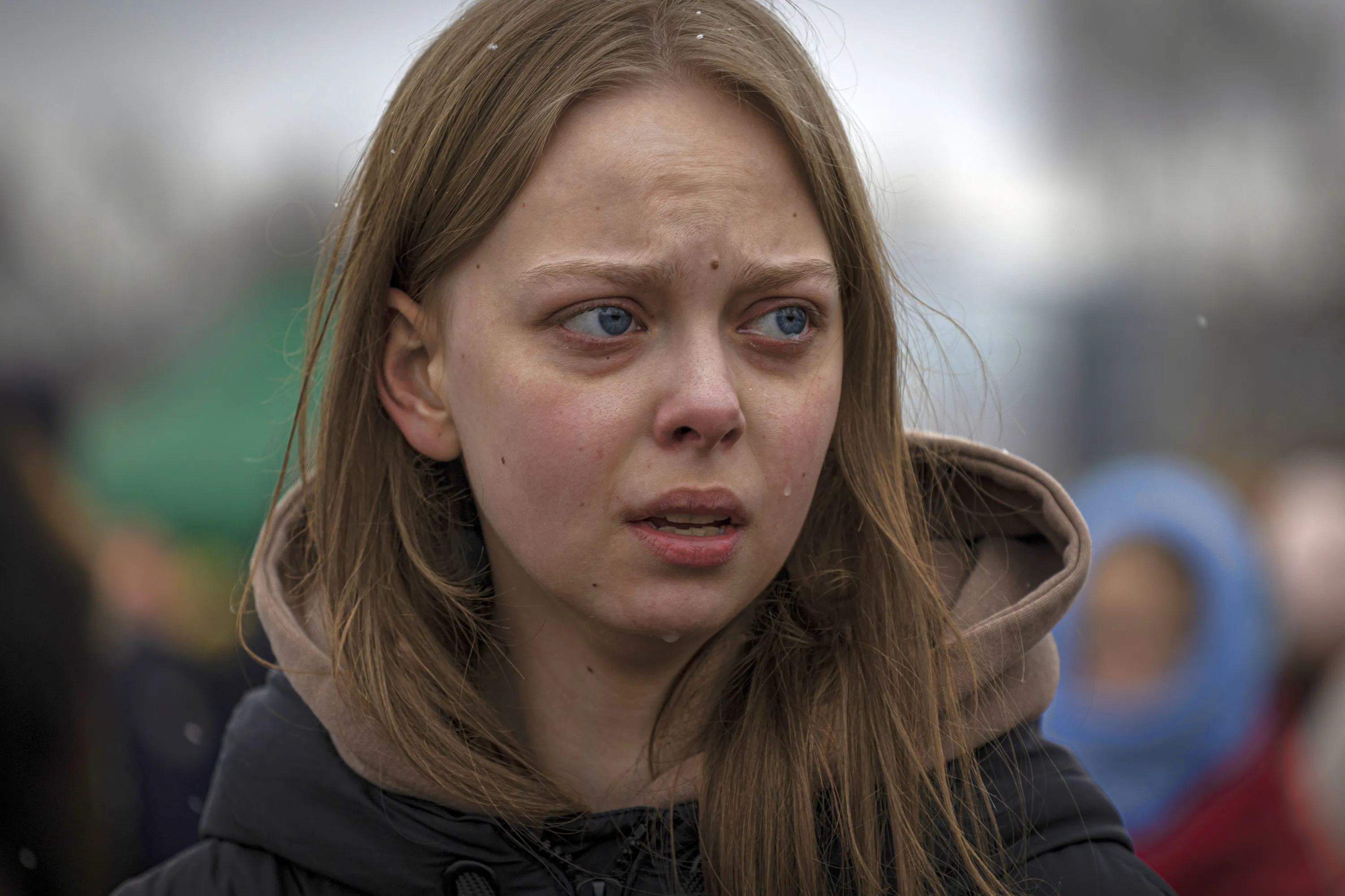 A refugee cries shortly after crossing at the Medyka border crossing in Poland on Saturday March 5, 2022. The number of Ukrainians forced from their country since the Russian invasion has been increasing on a daily basis. (Photo by Marc Sanye/AP Photo)