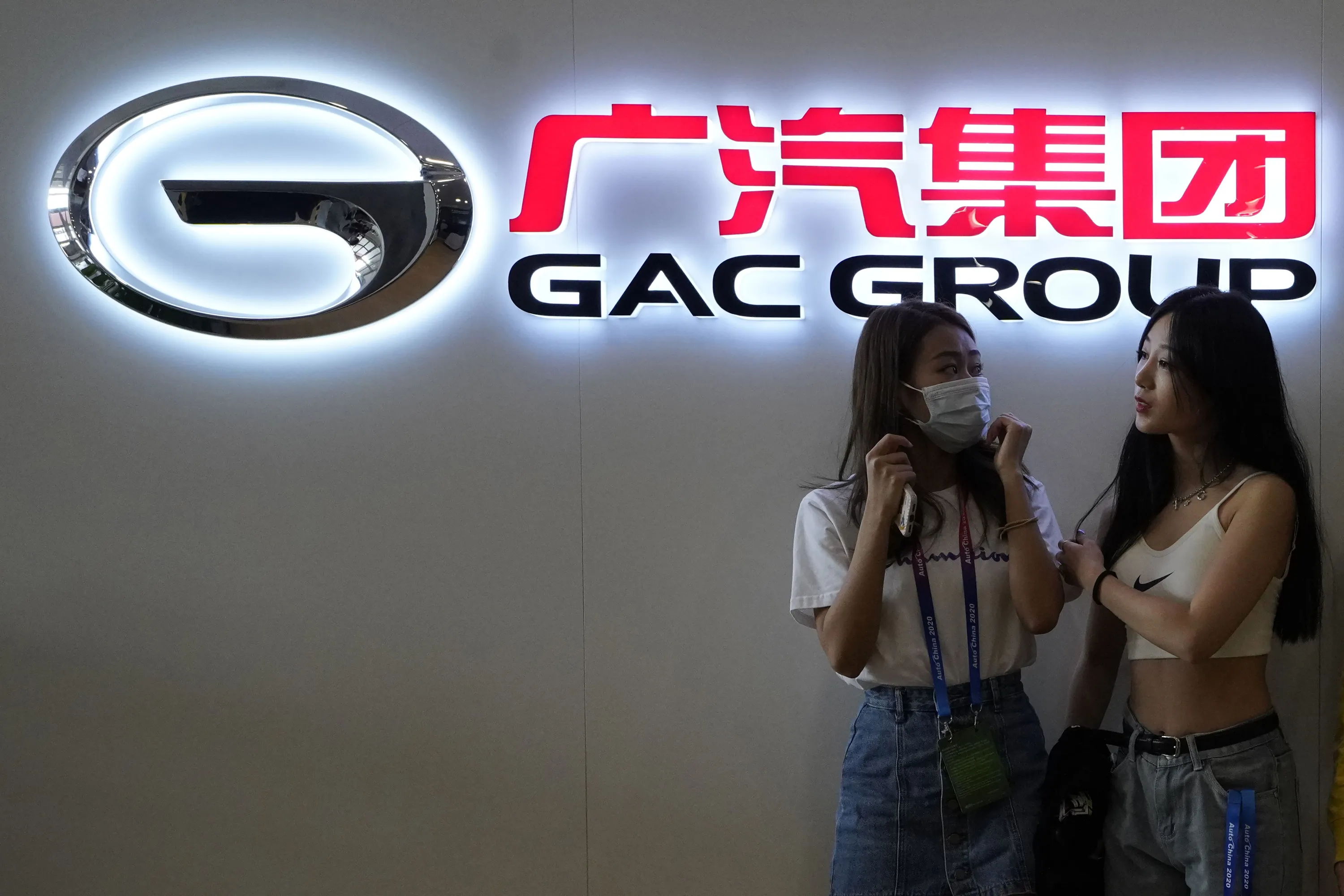 Two women stand near the logo for the Guangzhou Automobile Group Co. Ltd during an auto show in Beijing on Sunday, September 27, 2020. Carmaker Stellantis moves to consolidate its position in fast-growing China looked off to a rocky start after one of its JV partners said it hadn’t been consulted before an announcement of plans to take a controlling stake. Stellantis plans to lay out its strategy March 1, but has offered some hints in announcements this week. They include plans to increase the stake in Chinese partner GAC Stellantis from 50% to 75% under new rules allowing more foreign investment, and an announcement Friday that the other JV, with Dongfeng, had doubled sales in 2021. (Photo by Ng Han Guan/AP Photo)