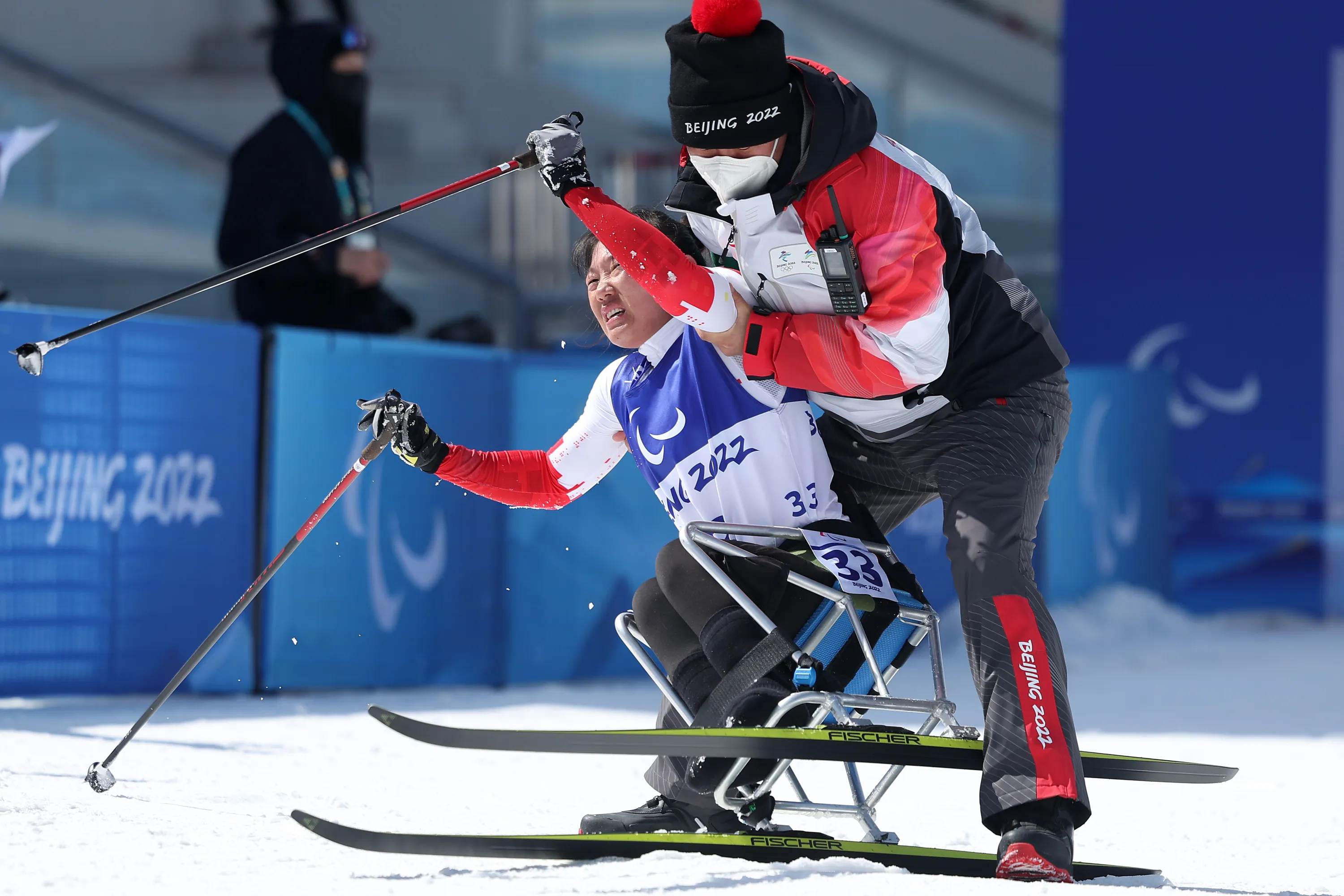 Panpan Li of Team China competes in the Para Cross-Country Skiing Women's Long Distance Sitting during day two of the Beijing 2022 Winter Paralympics at on March 06, 2022 in Zhangjiakou, China. (Photo by Lintao Zhang/Getty Images)