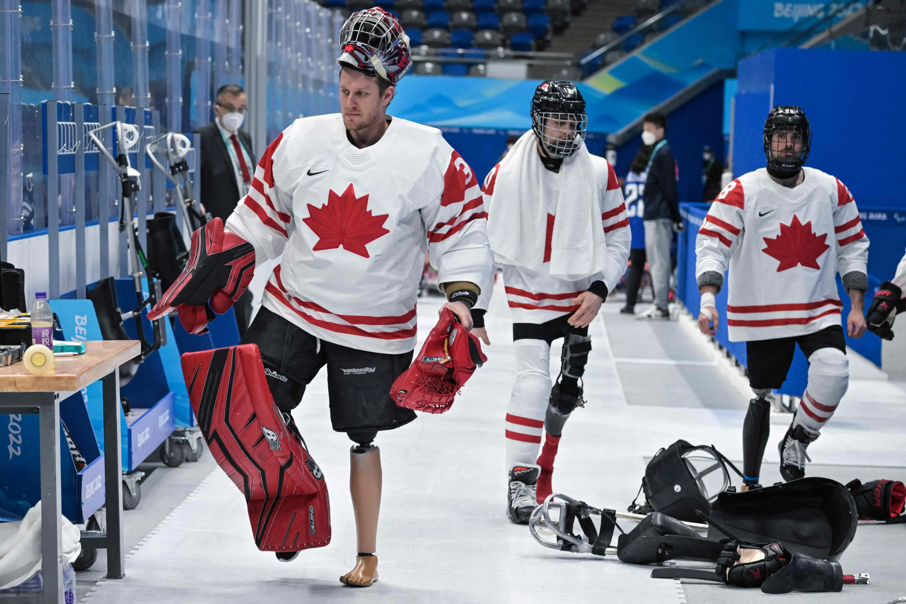 Canada's athletes walk with their prosthetic leg before the ice hockey preliminary round match between Canada and the US during the Beijing 2022 Winter Paralympic Games in Beijing on March 5, 2022. (Photo by Mohd Rasfan/AFP Photo)