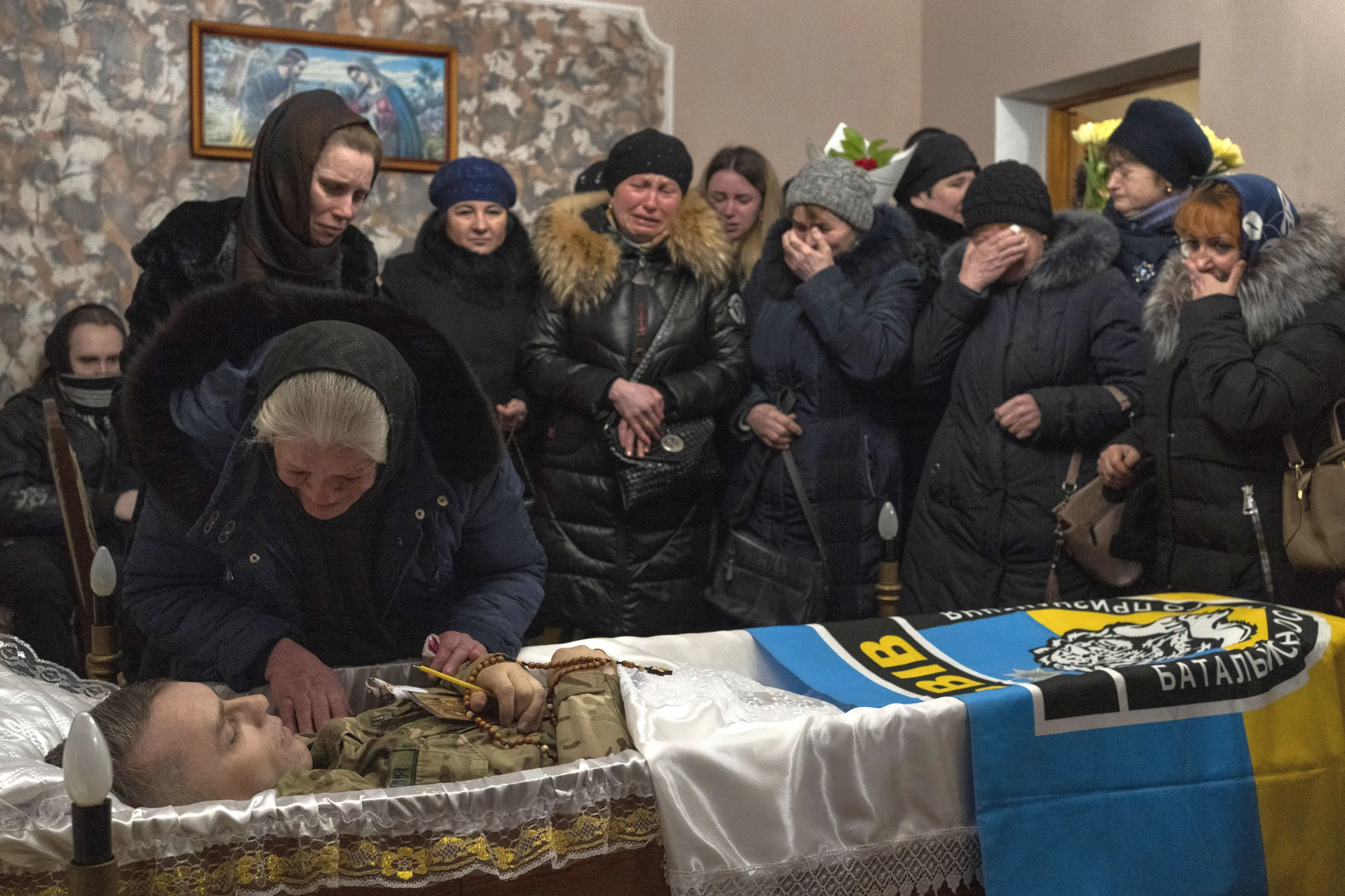 Relatives and friends mourn the body of senior police sergeant Roman Rushchyshyn in the village of Soposhyn, outskirts of Lviv, western Ukraine, Thursday, March 10, 2022, in Lviv. Rushchyshyn, a member of the Lviv Special Police Patrol Battalion, was killed in the Luhansk Region. Temporary cease-fires to allow evacuations and humanitarian aid have repeatedly faltered, with Ukraine accusing Russia of continuing its bombardments. (Photo by Bernat Armangue/AP Photo)