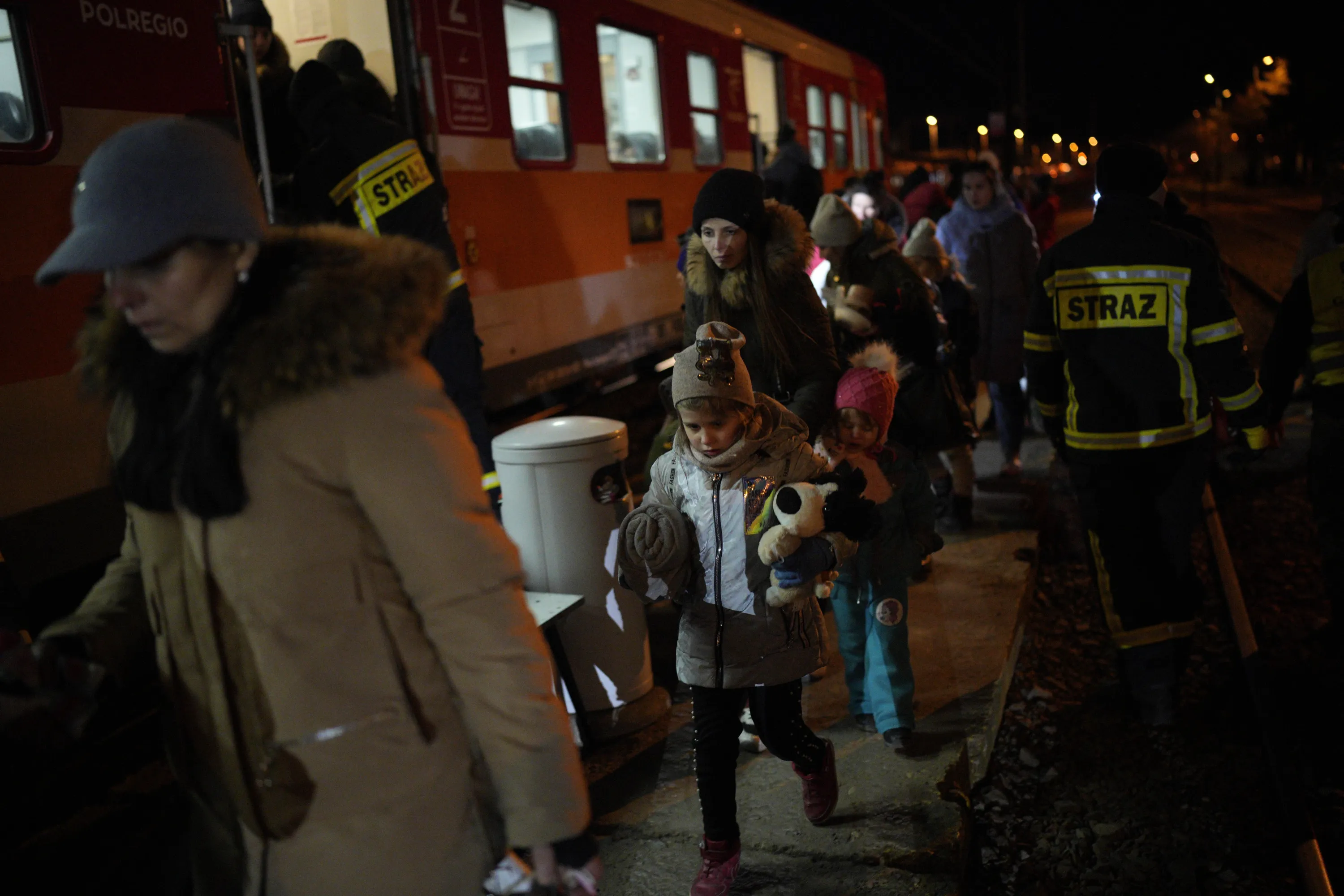 Refugees fleeing war in neighboring Ukraine board a train at the Medyka border crossing, Poland, Thursday, March 10, 2022. (Photo by Daniel Cole/AP Photo)