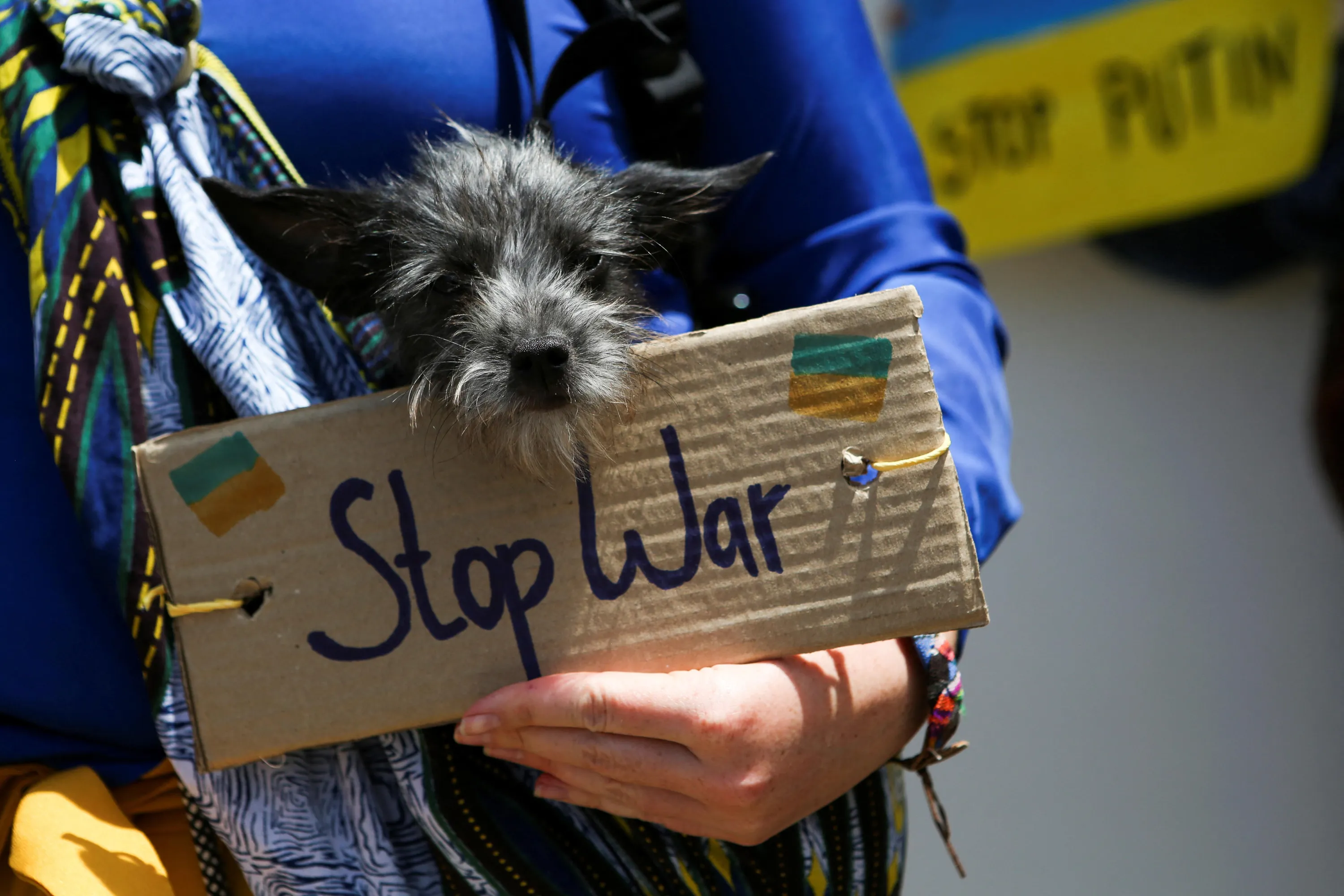 A woman holds a sign and her dog during an anti-war protest in support of Ukraine amid Russia's invasion, outside the Russian Embassy in San Jose, Costa Rica on March 2, 2022. (Photo by Mayela Lopez/Reuters)