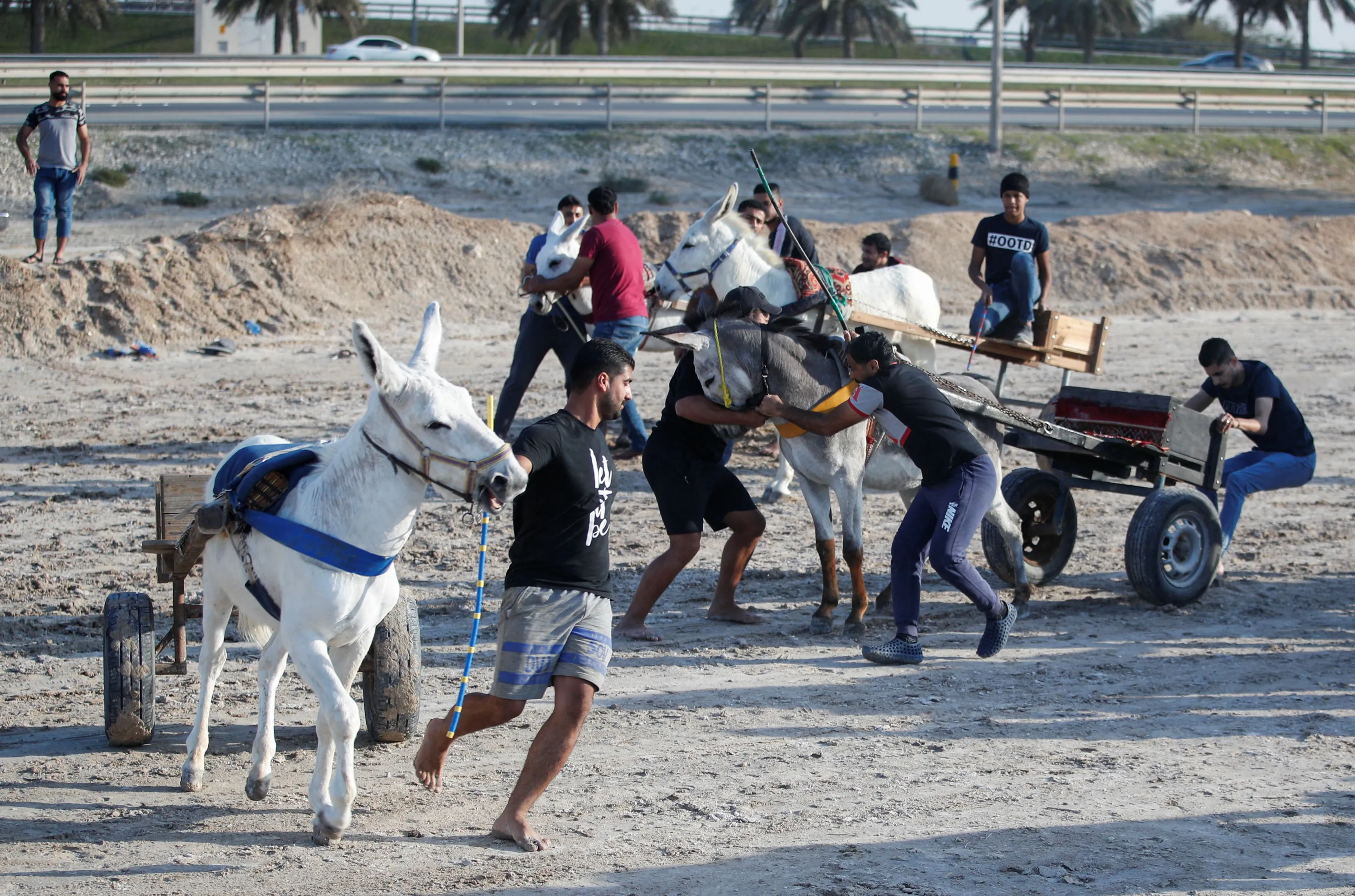 Team members try to hold their donkeys on the start-lane ahead of a weekly donkey race in Saar, Bahrain, February 18, 2022. (Photo by Hamad I Mohammed/Reuters)