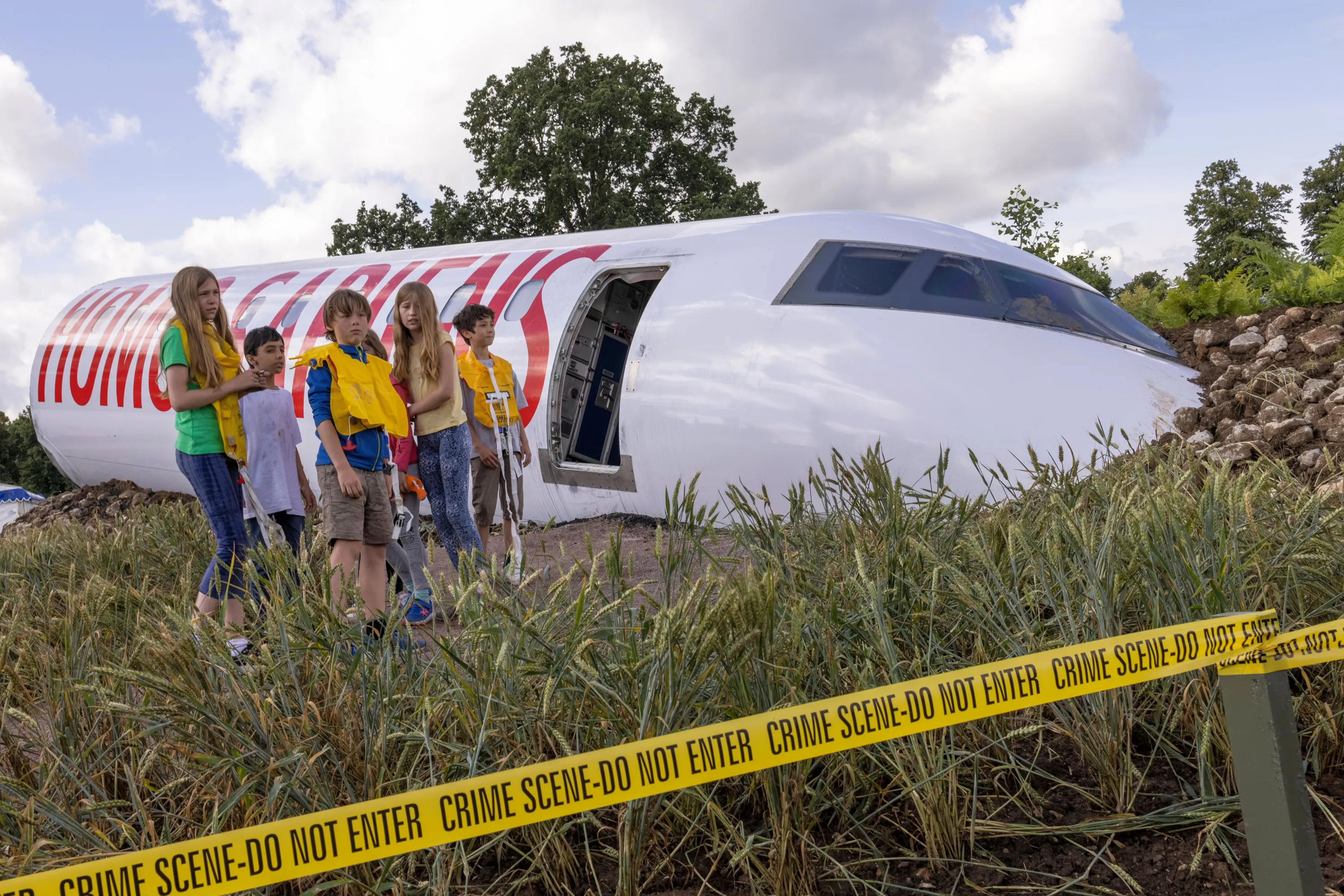 Children take part in a performance during a photocall in the “Extinction” show garden on July 05, 2021 in East Molesey, England. The garden, which included a “crashed” aircraft, aimed to address the “6th mass extinction threat to our planet caused by our continual exploitation and destruction of its natural resources”, and featured children walking around the scene of a downed aircraft. The Royal Horticultural Society's Hampton Court Palace Garden Festival resumed this year after having been cancelled last summer due to the Covid-19 pandemic. (Photo by Dan Kitwood/Getty Images)