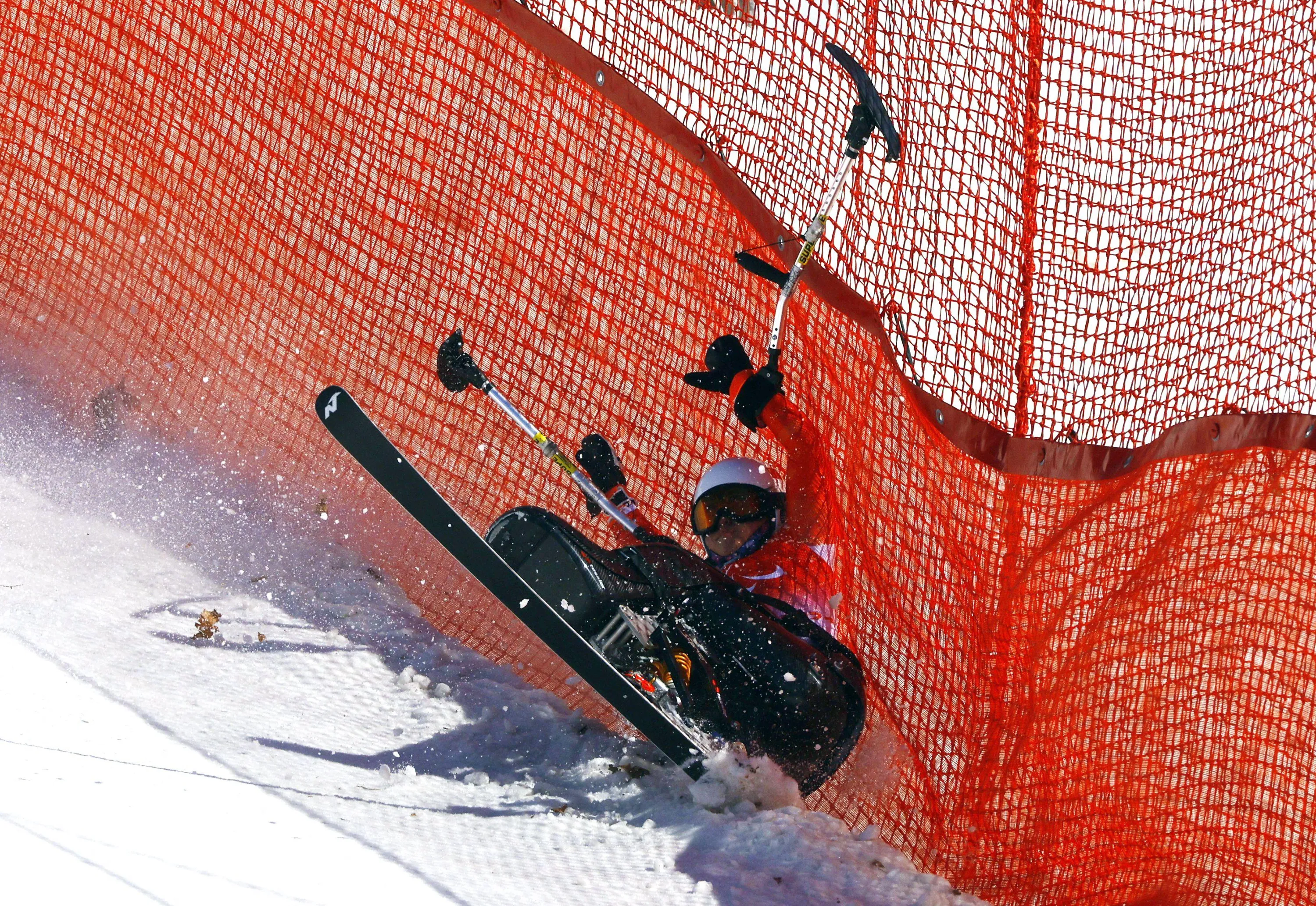Wenjing Zhang of Team China crashes in the Para Alpine Skiing Women's Super Combined Super-G at Yanqing National Alpine Skiing Centre during day three of the Beijing 2022 Winter Paralympics on March 07, 2022 in Yanqing, China. (Photo by Gonzalo Fuentes/Reuters)