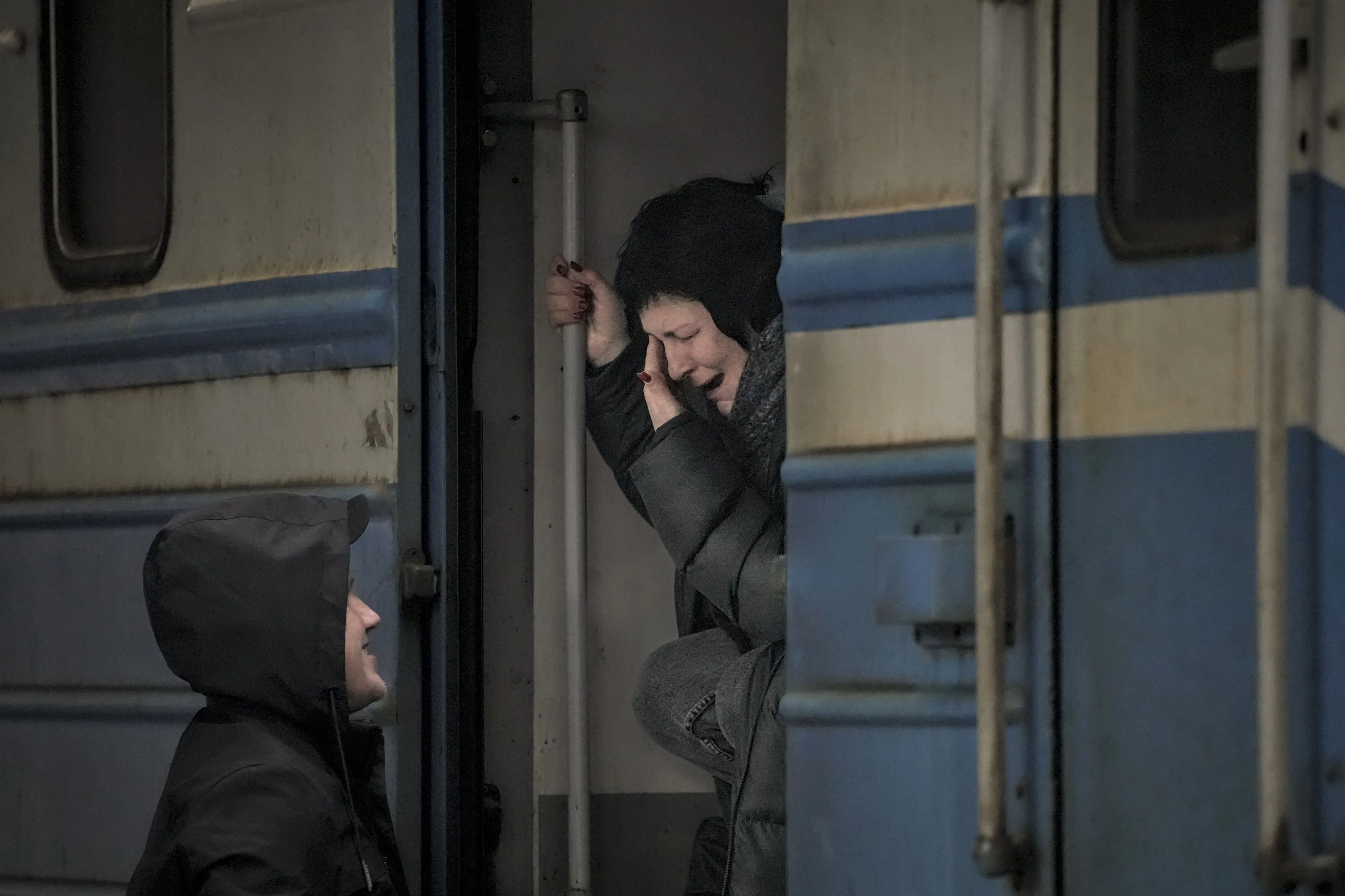 A woman on a Lviv bound train cries while she bids goodbye to a man in Kyiv, Ukraine, Saturday, March 12, 2022. (Photo by Vadim Ghirda/AP Photo)