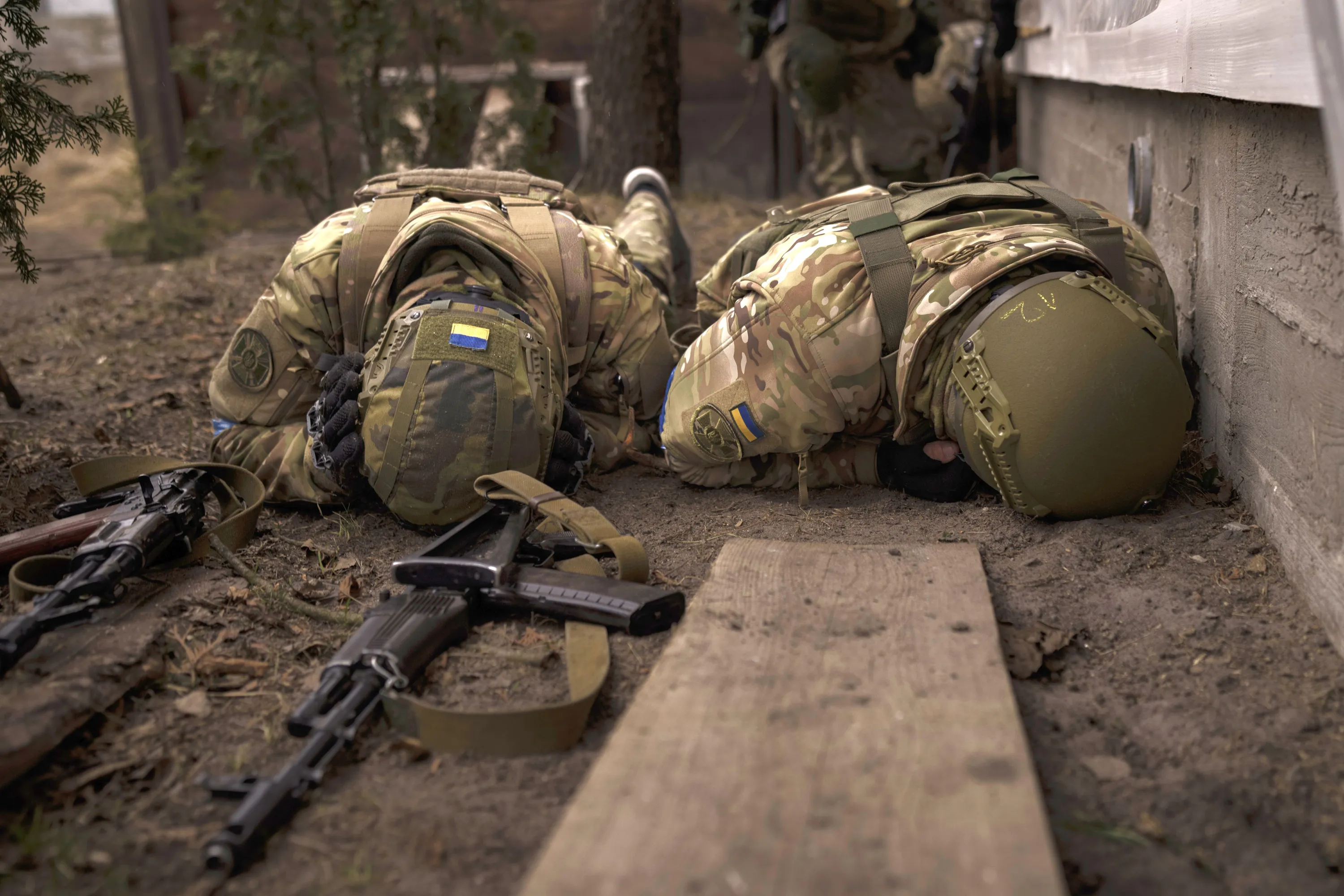 Ukrainian soldiers take cover from incoming artillery fire in Irpin, the outskirts of Kyiv, Ukraine, Sunday, March 13, 2022. (Photo by Felipe Dana/AP Photo)