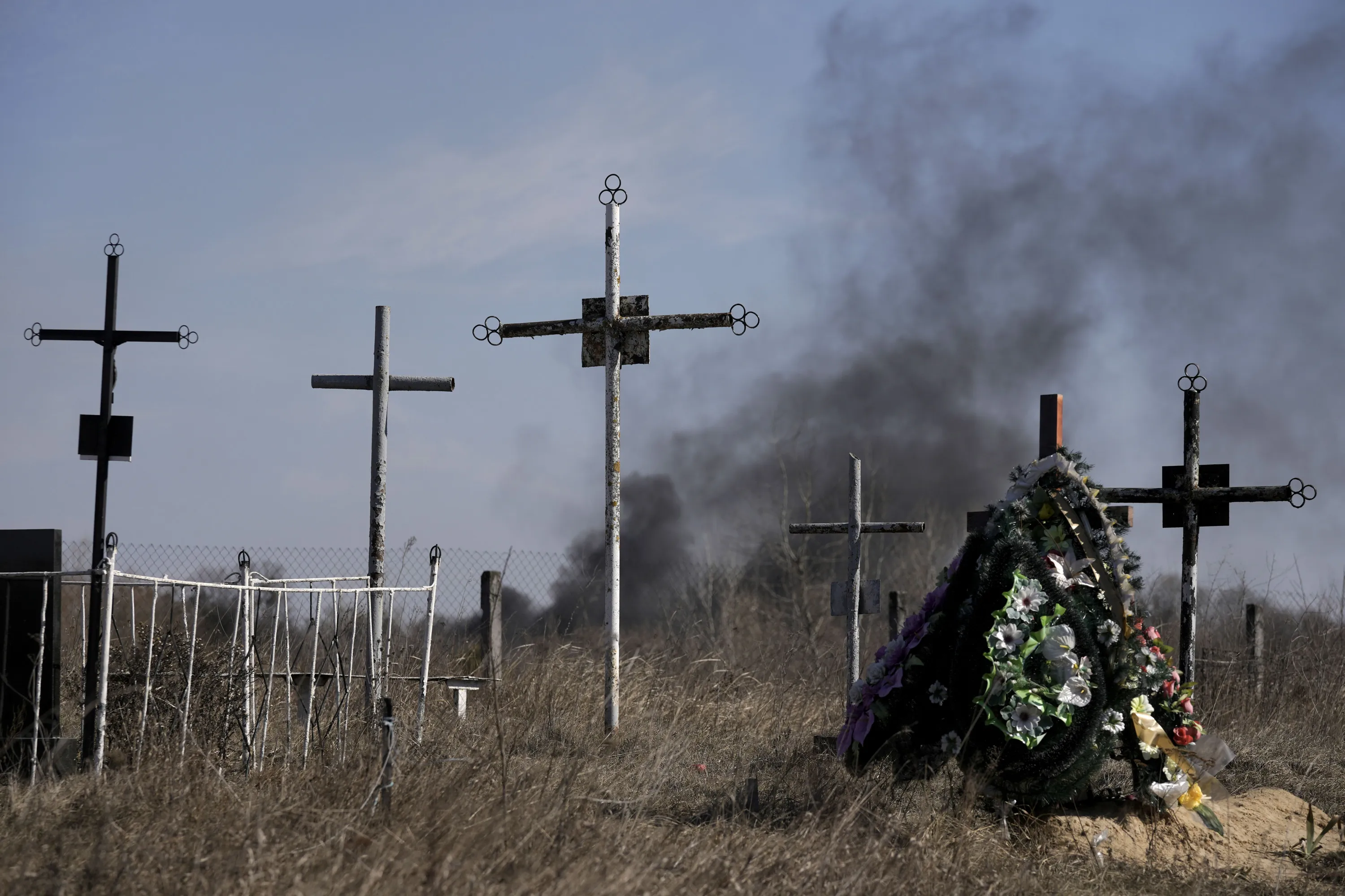 A smoke from shelling rises as a wreath of flowers is placed at a cemetery in Vasylkiv south west of Kyiv, Ukraine, Saturday, March 12, 2022. Russian forces appeared to make progress from northeast Ukraine in their slow fight to reach the capital, Kyiv, while tanks and artillery pounded places already under siege. (Photo by Vadim Ghirda/AP Photo)