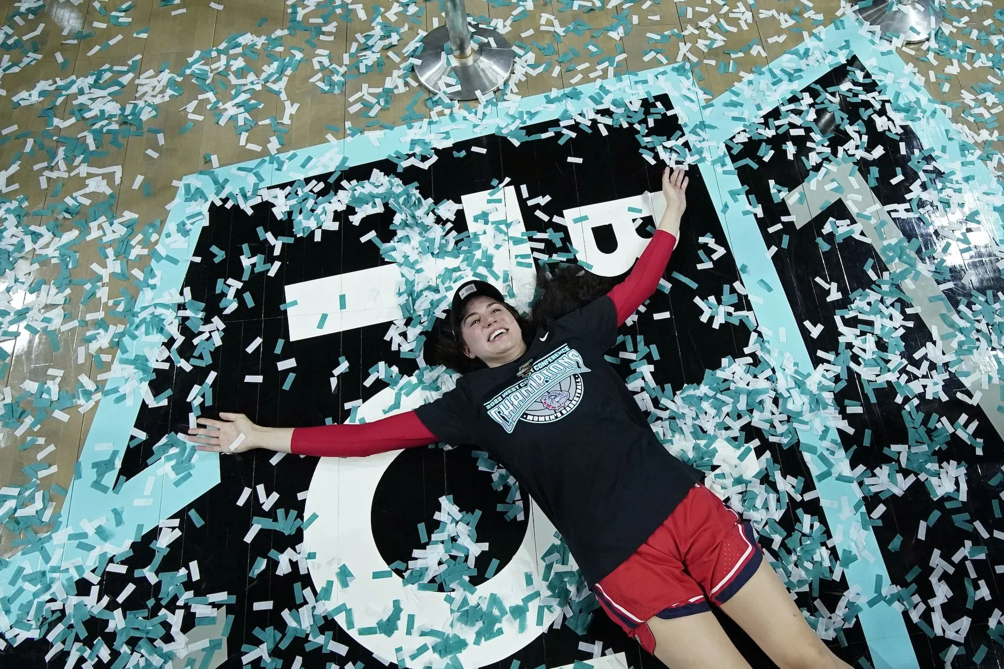 Gonzaga's Melody Kempton celebrates after her team defeated BYU in an NCAA women's championship college basketball game at the West Coast Conference tournament Tuesday, March 8, 2022, in Las Vegas. (Photo by John Locher/AP Photo)