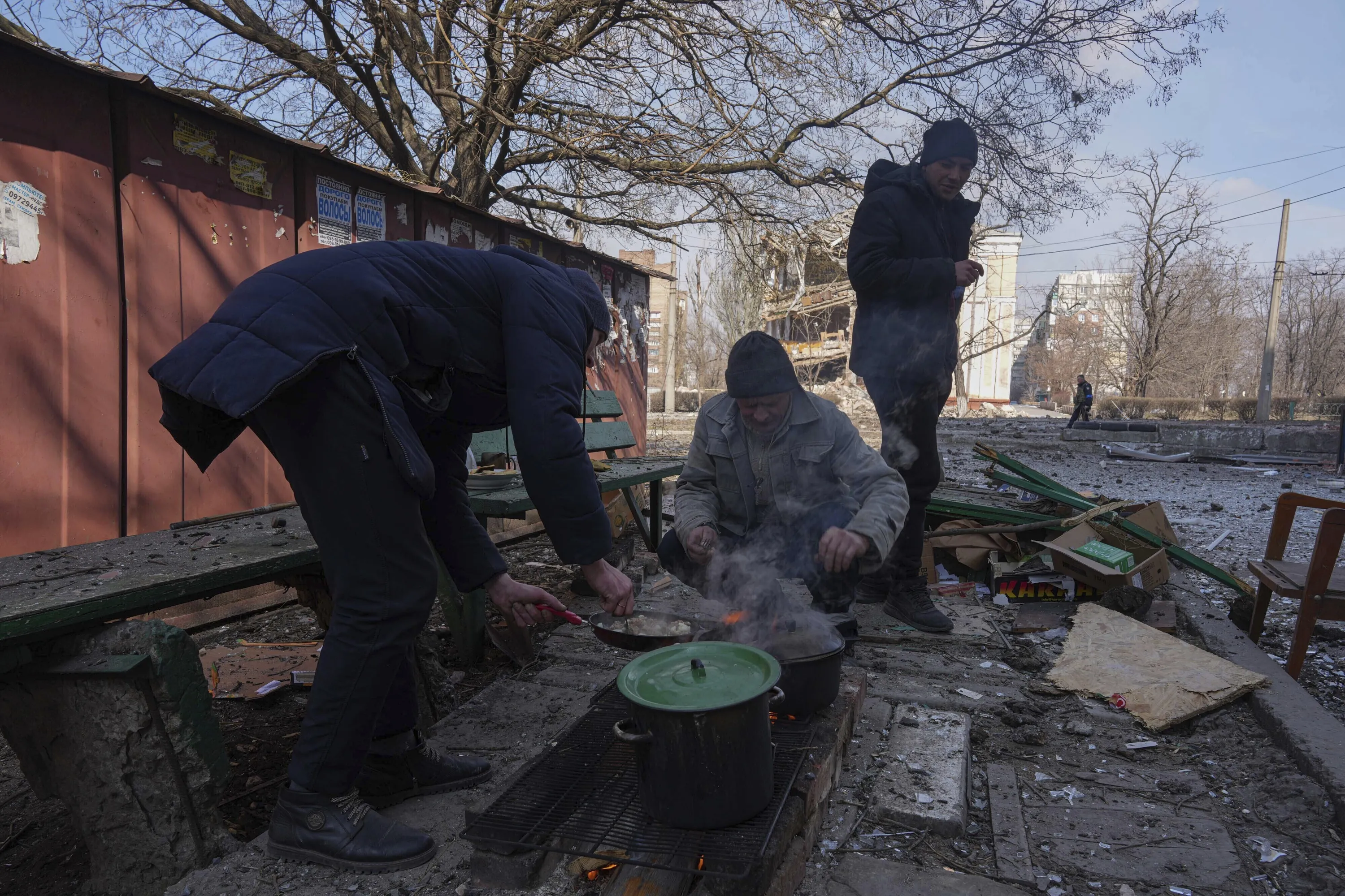 Men cook a meal in a street in Mariupol, Ukraine, Sunday, March 13, 2022. (Photo by Evgeniy Maloletka/AP Photo)