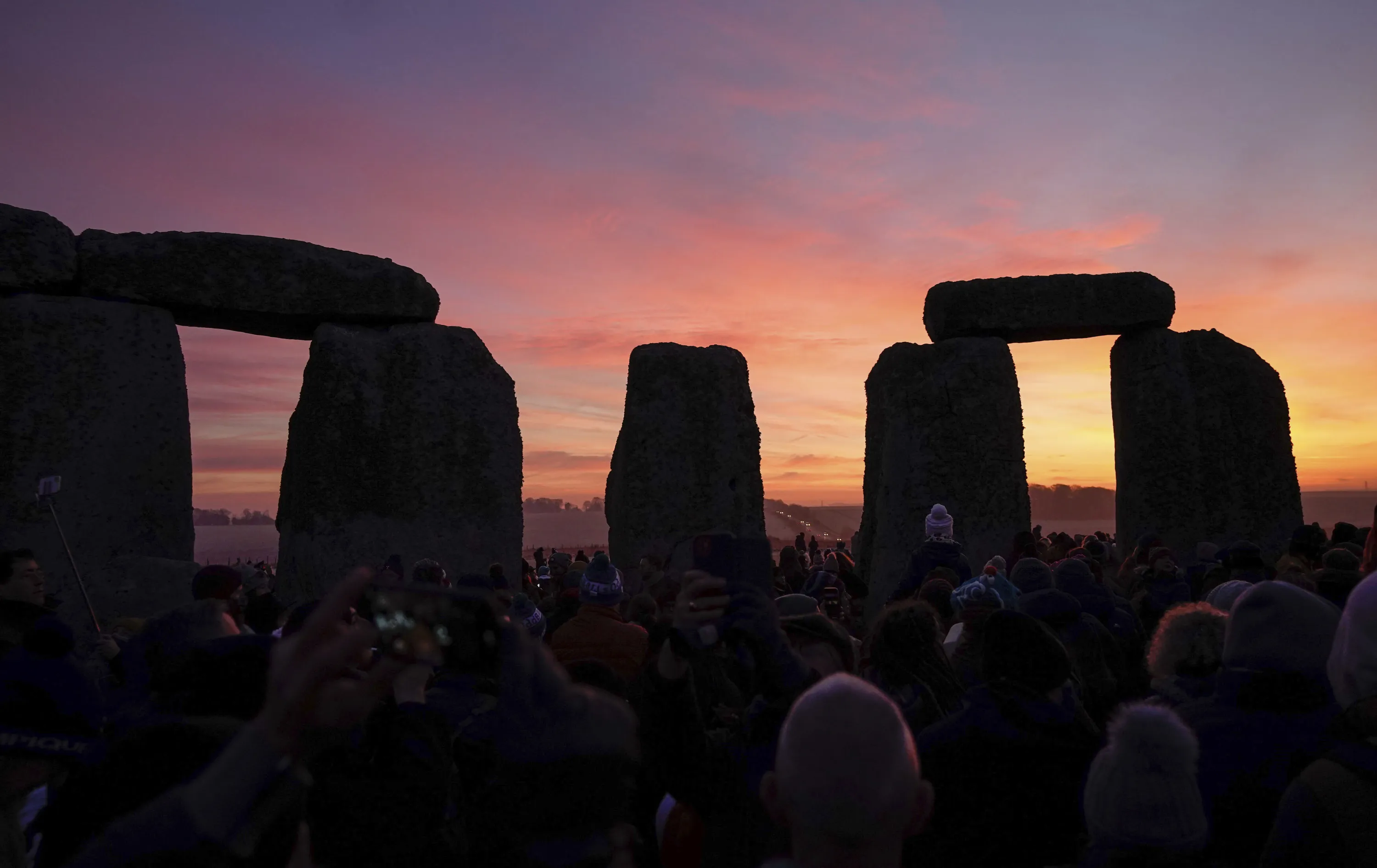 The sun begins to rise behind the stones as people gather to take part in the winter solstice celebrations during sunrise at the Stonehenge prehistoric monument on Salisbury Plain in Wiltshire on Wednesday, December 22, 2021. (Photo by Andrew Matthews/PA Images via Getty Images)