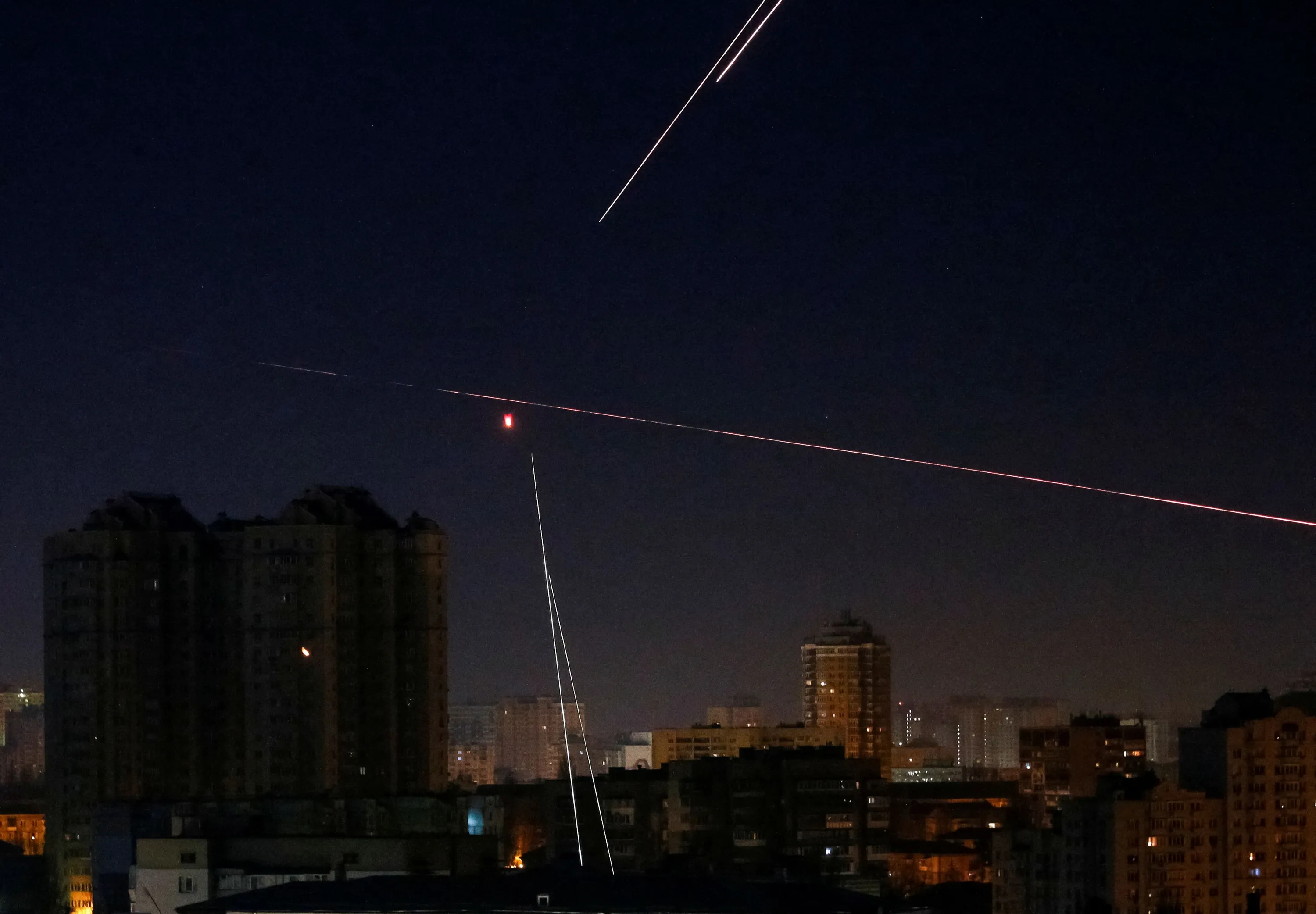 Tracers are seen in the night sky as Ukrainian servicemen fire on the drone as Russia's attack on Ukraine continues, in Kyiv, Ukraine on March 14, 2022. (Photo by Gleb Garanich/Reuters)