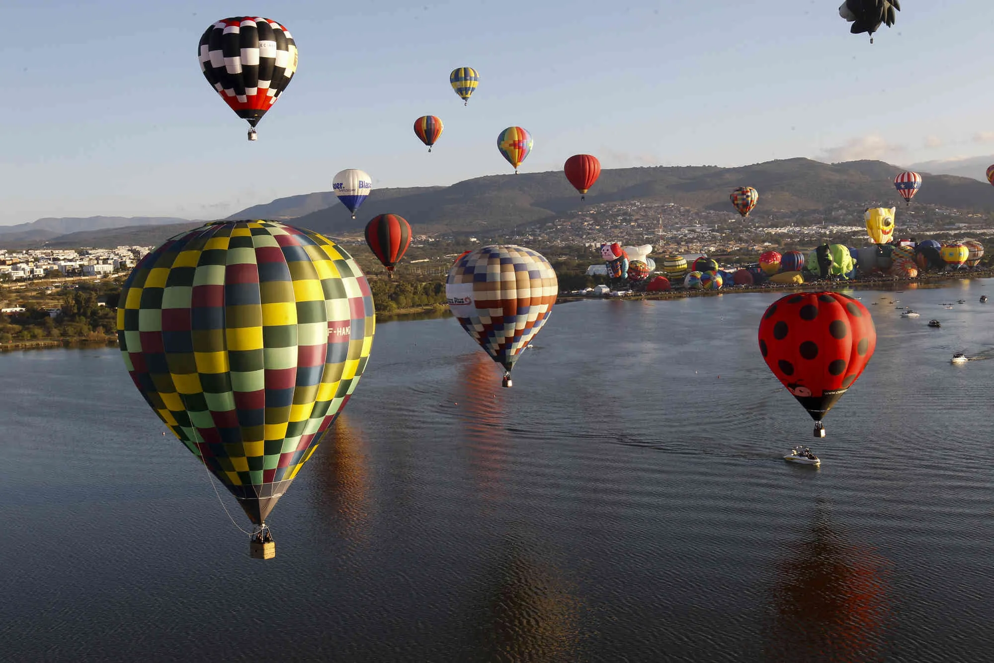 Hot-air balloons fly above the Papalote dam during the International Hot Air Balloon Festival in Leon, Mexico, Friday, November 12, 2021. (Photo by Mario Armas/AP Photo)