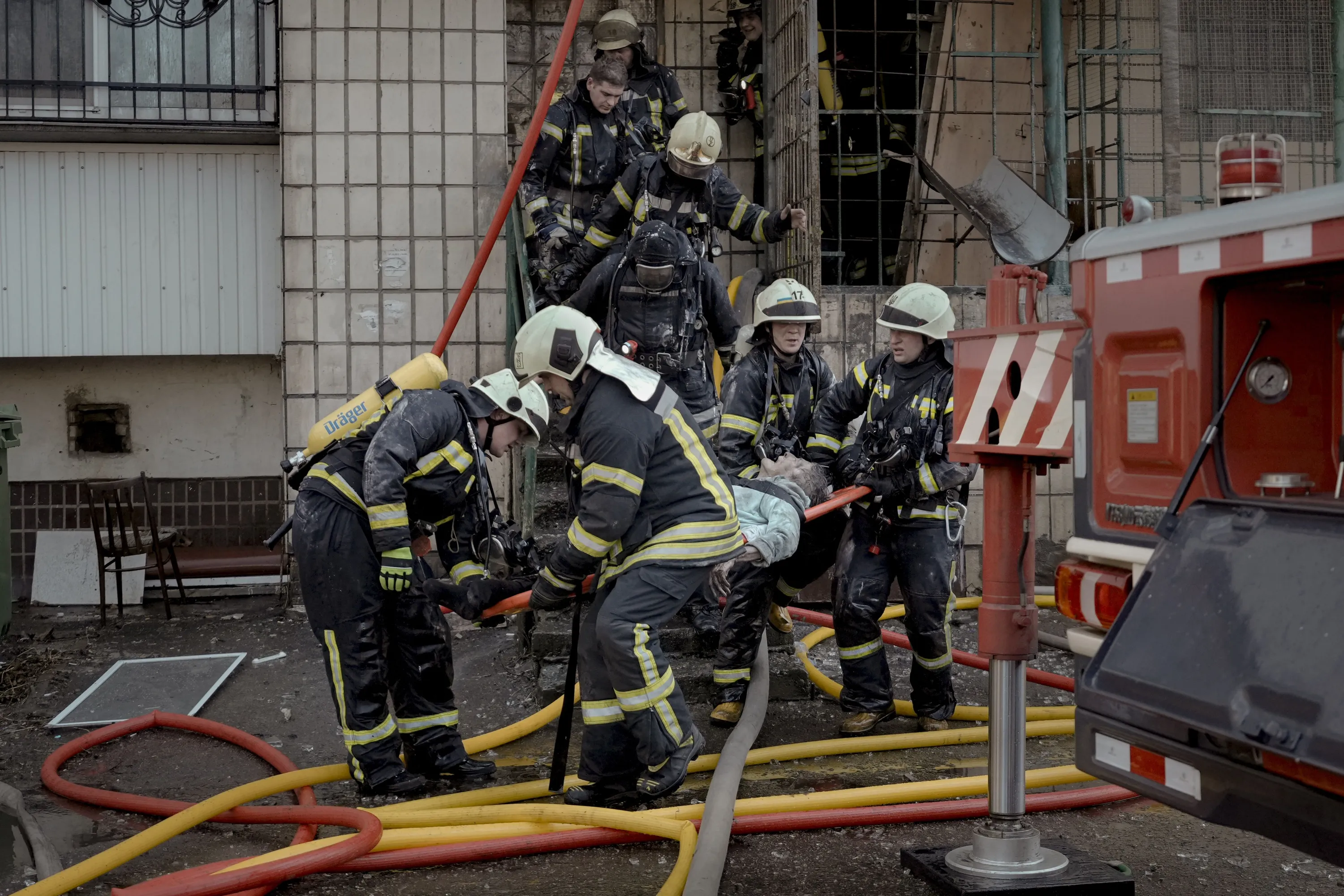 Firefighters carry the dead body of an elderly woman after a bombing in a residential area in Kyiv, Ukraine, Tuesday, March 15, 2022. Russia's offensive in Ukraine has edged closer to central Kyiv with a series of strikes hitting a residential neighborhood as the leaders of three European Union member countries planned a visit to Ukraine's embattled capital. (Photo by Vadim Ghirda/AP Photo)