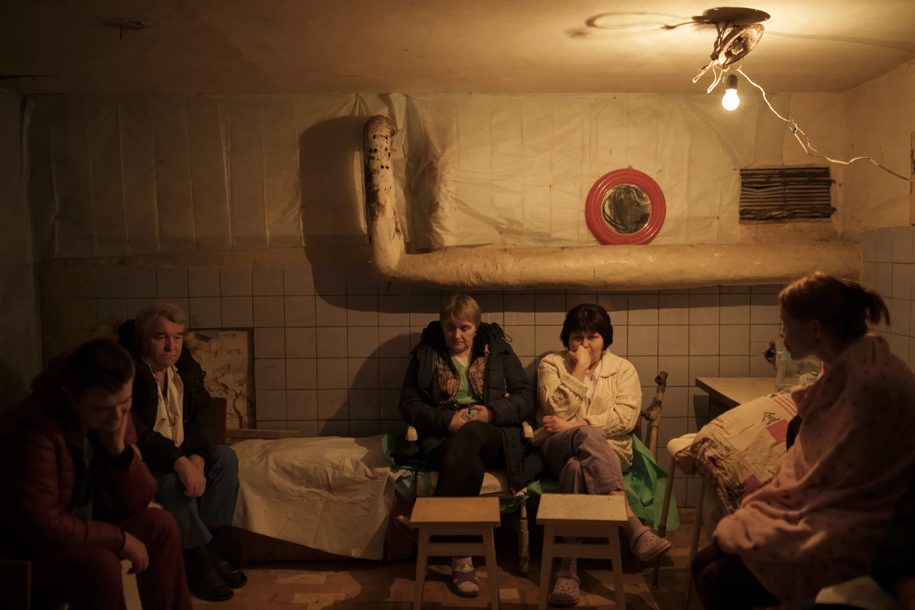 Hospital staff sit in a basement, used as a bomb shelter, during an air raid alarm in Brovary, north of Kyiv, Ukraine, Thursday, March 17, 2022. (Photo by Felipe Dana/AP Photo)