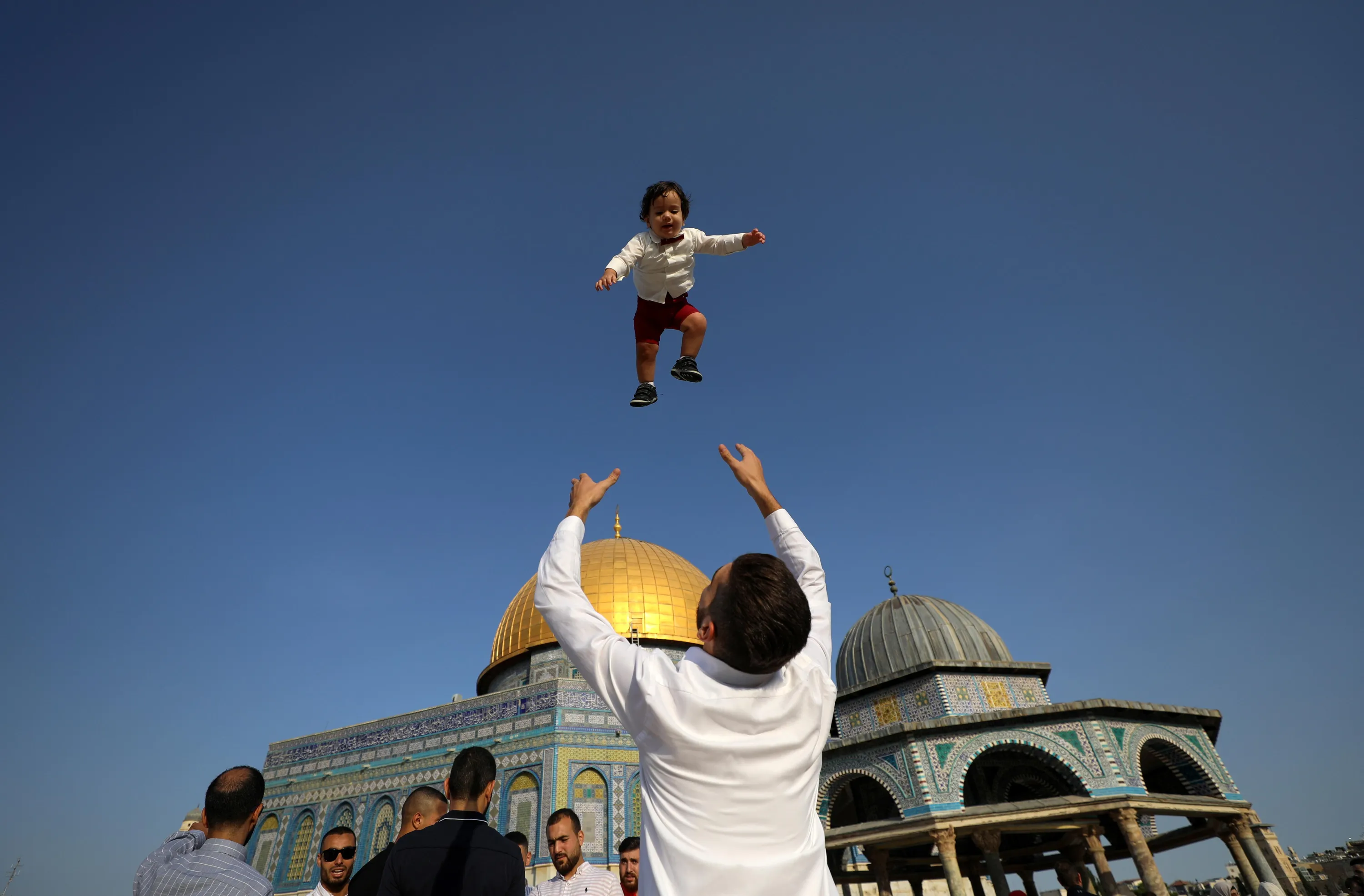 Palestinians celebrate on the first day of Muslim holiday of Eid al-Adha on the compound known to Muslims as Noble Sanctuary and Jews as Temple Mount, in Jerusalem's Old City on July 20, 2021. (Photo by Ammar Awad/Reuters)