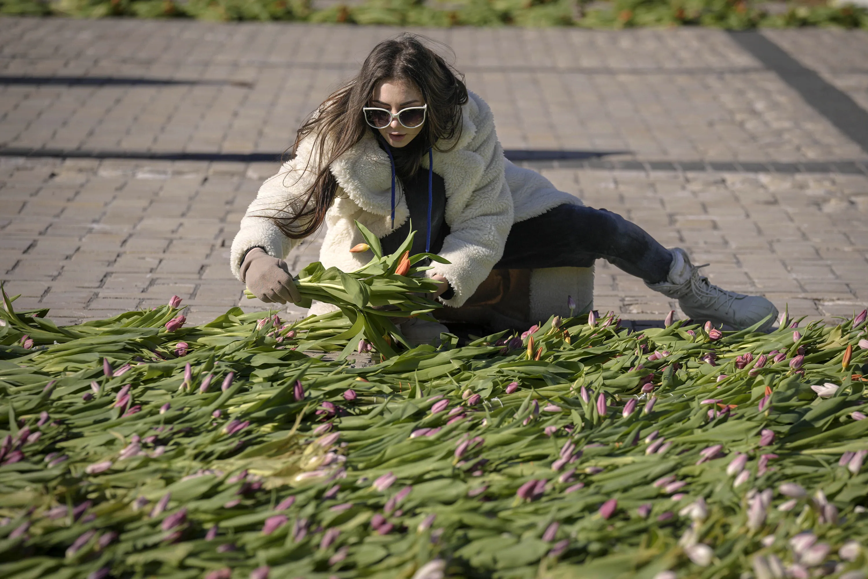 A woman arranges bunches of tulips on the pavement in Sophia square in Kyiv, Ukraine, Friday, March 18, 2022. Residents of the Ukrainian capital of Kyiv on took to a central square to arrange some 1.5 million tulips in the shape of the country's coat of arms, in a defiant show of normalcy as Russian forces surround and bomb the city. (Photo by Vadim Ghirda/AP Photo)