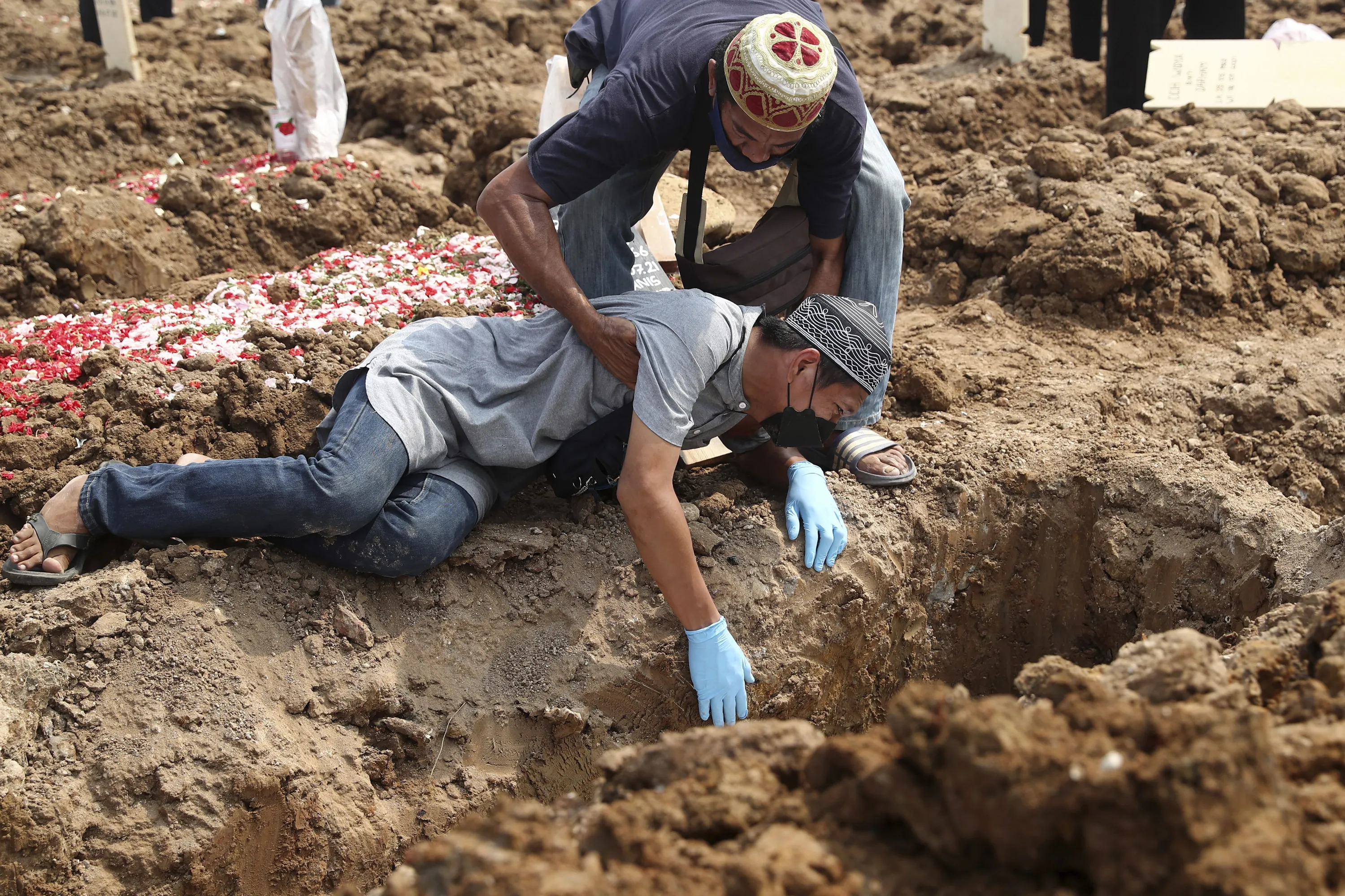 A man falls on the ground as he weeps during the burial of a relative who died of COVID-19 at Rorotan Cemetery in Jakarta, Indonesia, Wednesday, July 7, 2021. Indonesia is facing a devastating second wave of coronavirus as hospitals grapple with soaring cases amid widespread shortages of oxygen and patients were increasingly dying in isolation at home. (Photo by Tatan Syuflana/AP Photo)