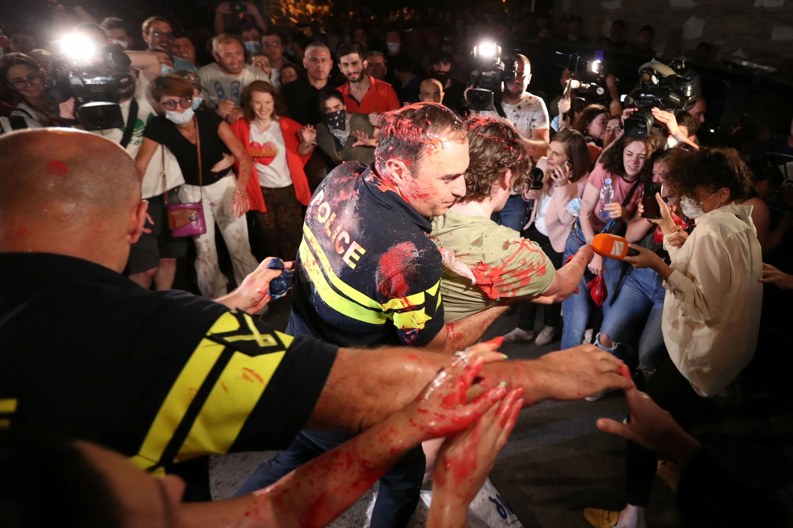Opposition activists scuffle with police during a rally, following the death of a cameraman who was beaten up during violence against LGBT activists last week, to demand the resignation of the prime minister and government, in Tbilisi, Georgia on July 12, 2021. (Photo by Irakli Gedenidze/Reuters)