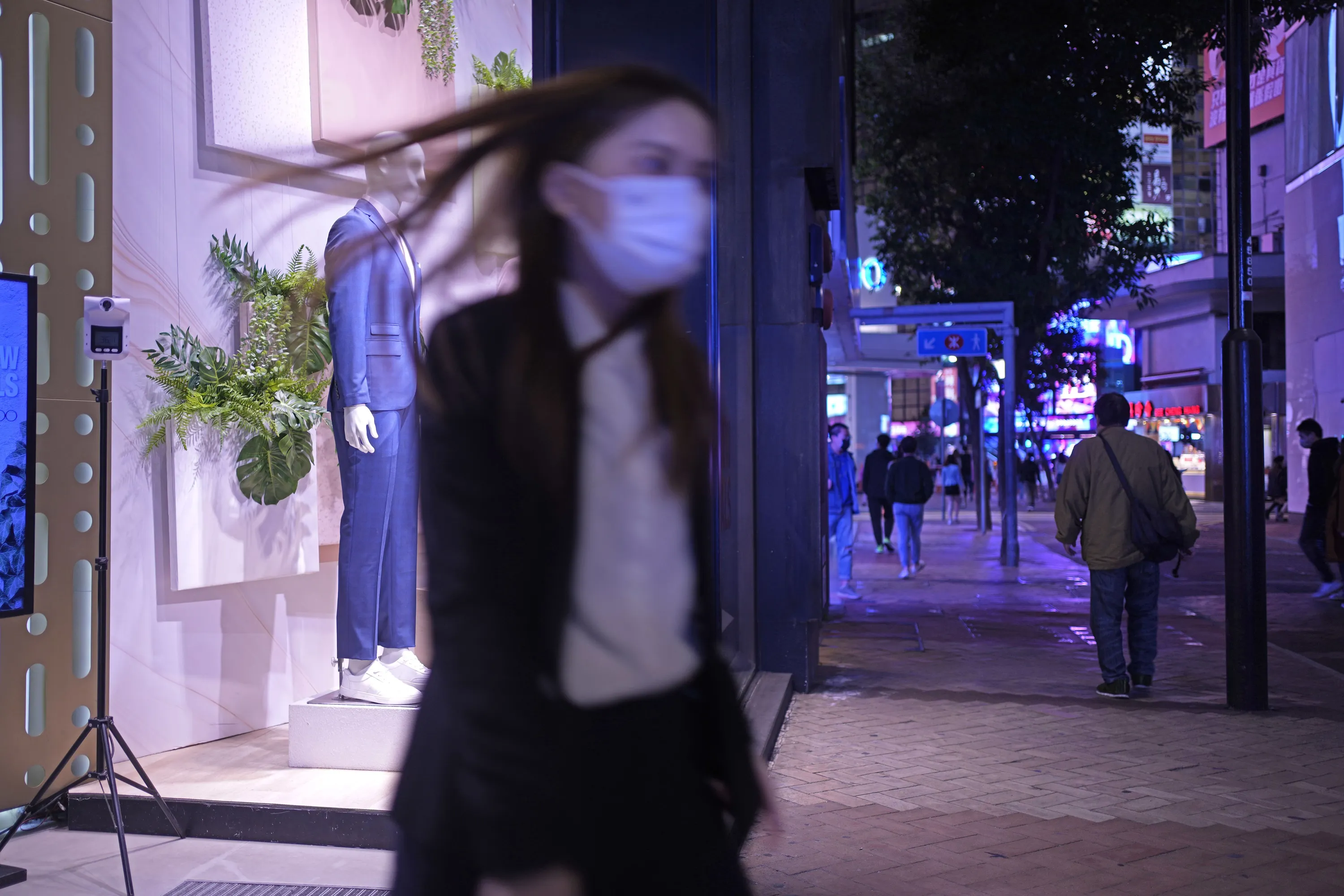 A woman walks on a quiet street usually packed with shoppers in Causeway Bay, a famous shopping district in Hong Kong Thursday, March 10, 2022. Hong Kong's neon lights are still on, but COVID-19 has turned off a lot of the city's usual energy. Instead, now there is an unusual sense of limbo. Busy shopping streets and office districts are very much emptier than ever before. (Photo by Vincent Yu/AP Photo)