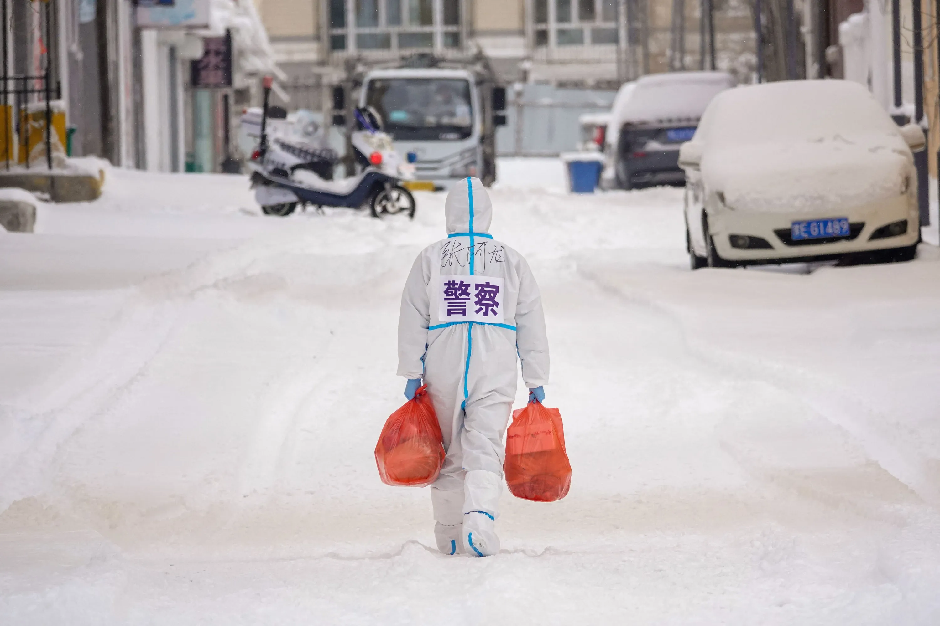 A police officer wearing personal protective equipment (PPE) carries food and daily supplies that will be distributed to residents at a restricted residental area due to the spread of the Covid-19 coronavirus in Manzhouli in China's northern Inner Mongolia region on March 15, 2022. (Photo by AFP Photo/China Stringer Network)