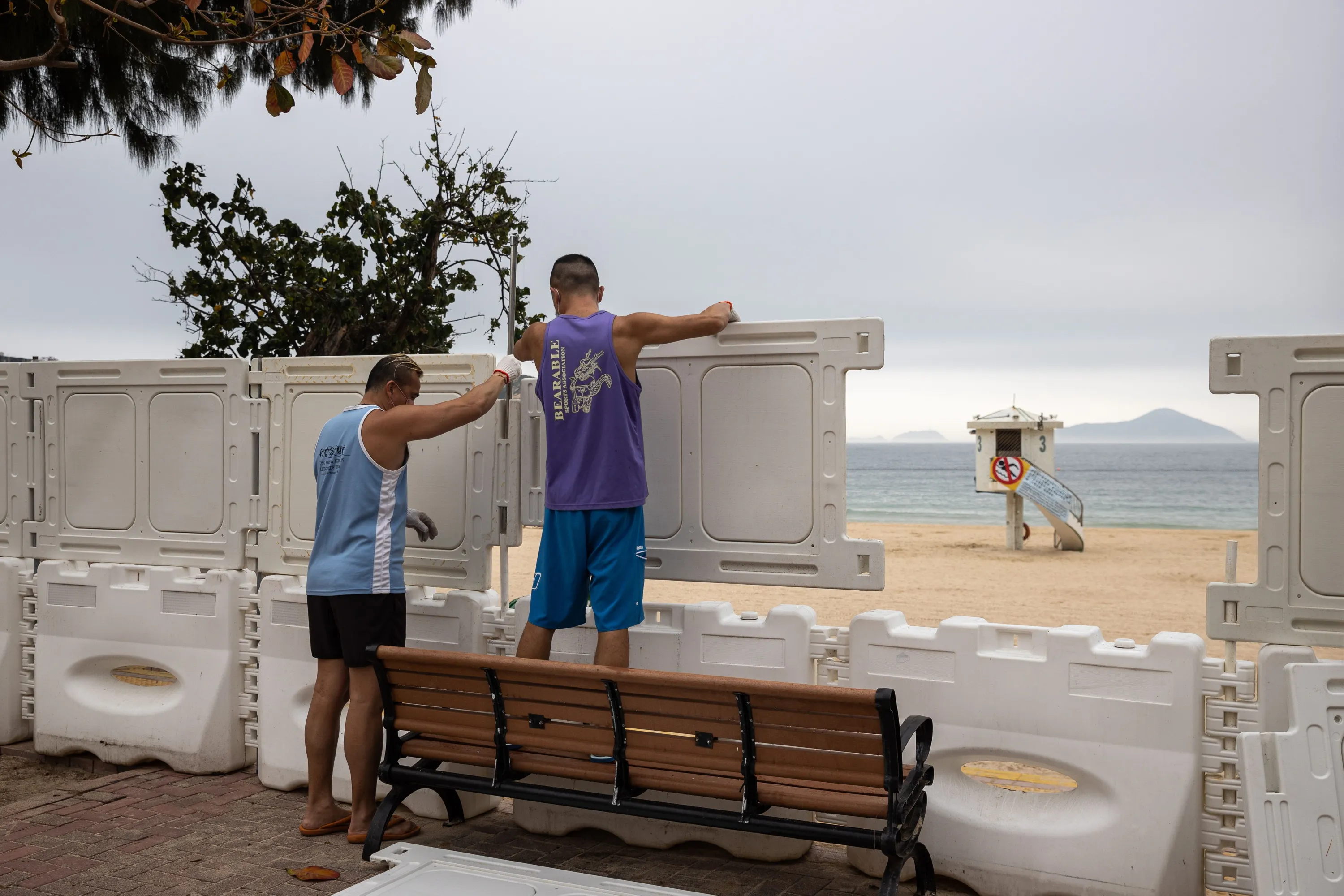 Staff erect fences to block the access to Shek O beach in Hong Kong, China, 17 March 2022. Hong Kong has closed government-managed beaches again in a further tightening of social distancing measures to prevent the spread of the COVID-19 infections, a few days after photos of busy beaches in Hong Kong went viral on Chinese social media. (Photo by Jerome Favre/EPA/EFE)