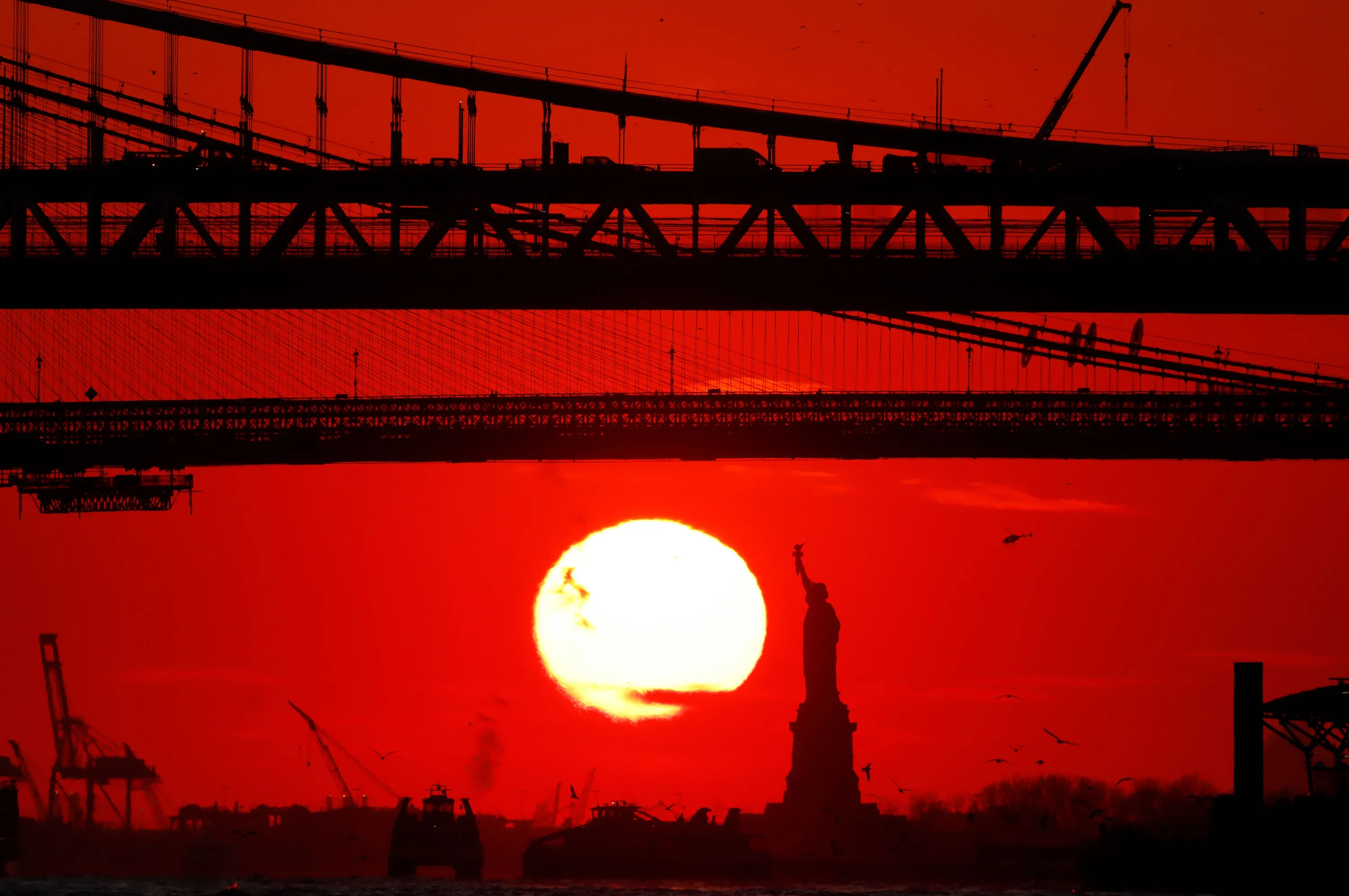 The sun sets behind the Statue of Liberty, Brooklyn Bridge, and Manhattan Bridge on January 31, 2022, in New York City. (Photo by Gary Hershorn/Getty Images)
