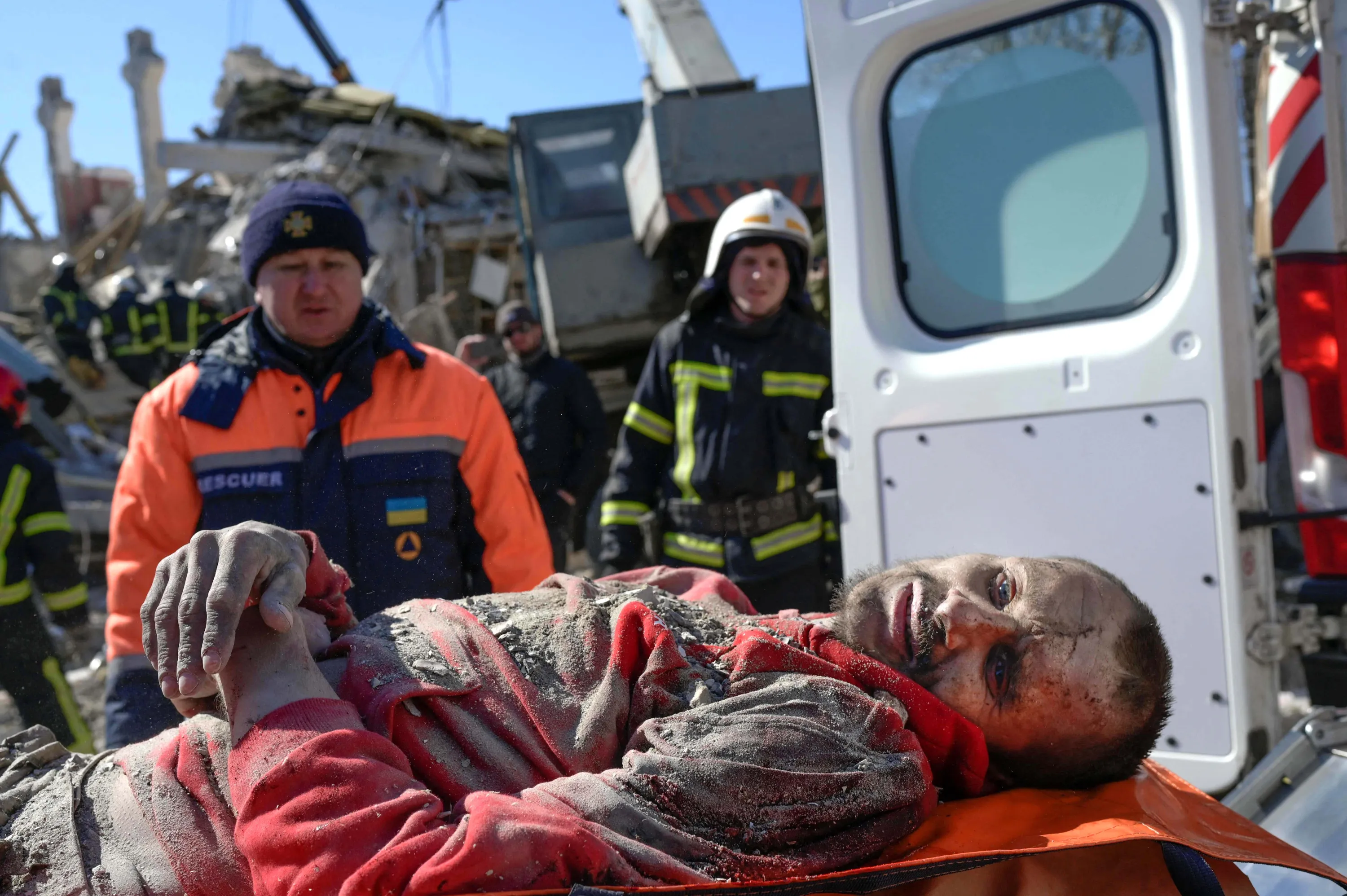 Rescuers carry a Ukrainian soldier saved after 30 hours from debris of the military school hit by Russian rockets, in Mykolaiv, southern Ukraine, on March 19, 2022. Ukrainian media reported that Russian forces had carried out a large-scale air strike on Mykolaiv, killing at least 40 Ukrainian soldiers at their brigade headquarters. (Photo by Bulent Kilic/AFP Photo)