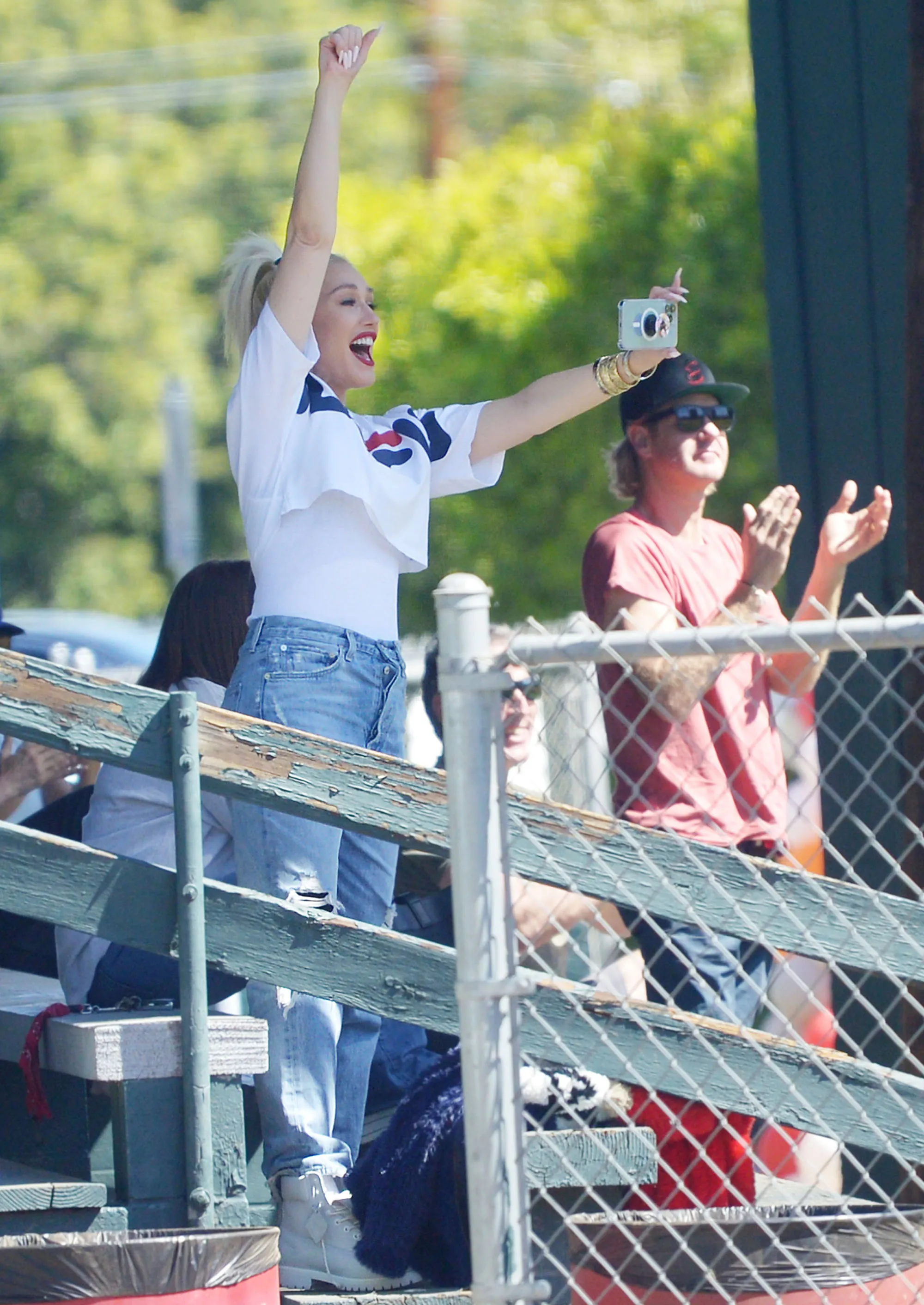 American singer-songwriter Gwen Stefani screams louder than anyone in the stands after Zuma got a base hit and made it all the way home to score at his baseball game in Los Angeles on Saturday, March 5, 2022. Zuma's team won the game. Blake Shelton didn't attend the game nor did Zuma's Dad Gavin Rossdale who is on tour in Australia with his band Bush. Gwen just came out with her new makeup line called GXVE by Gwen Stefani. (Photo by GAC/The Mega Agency)