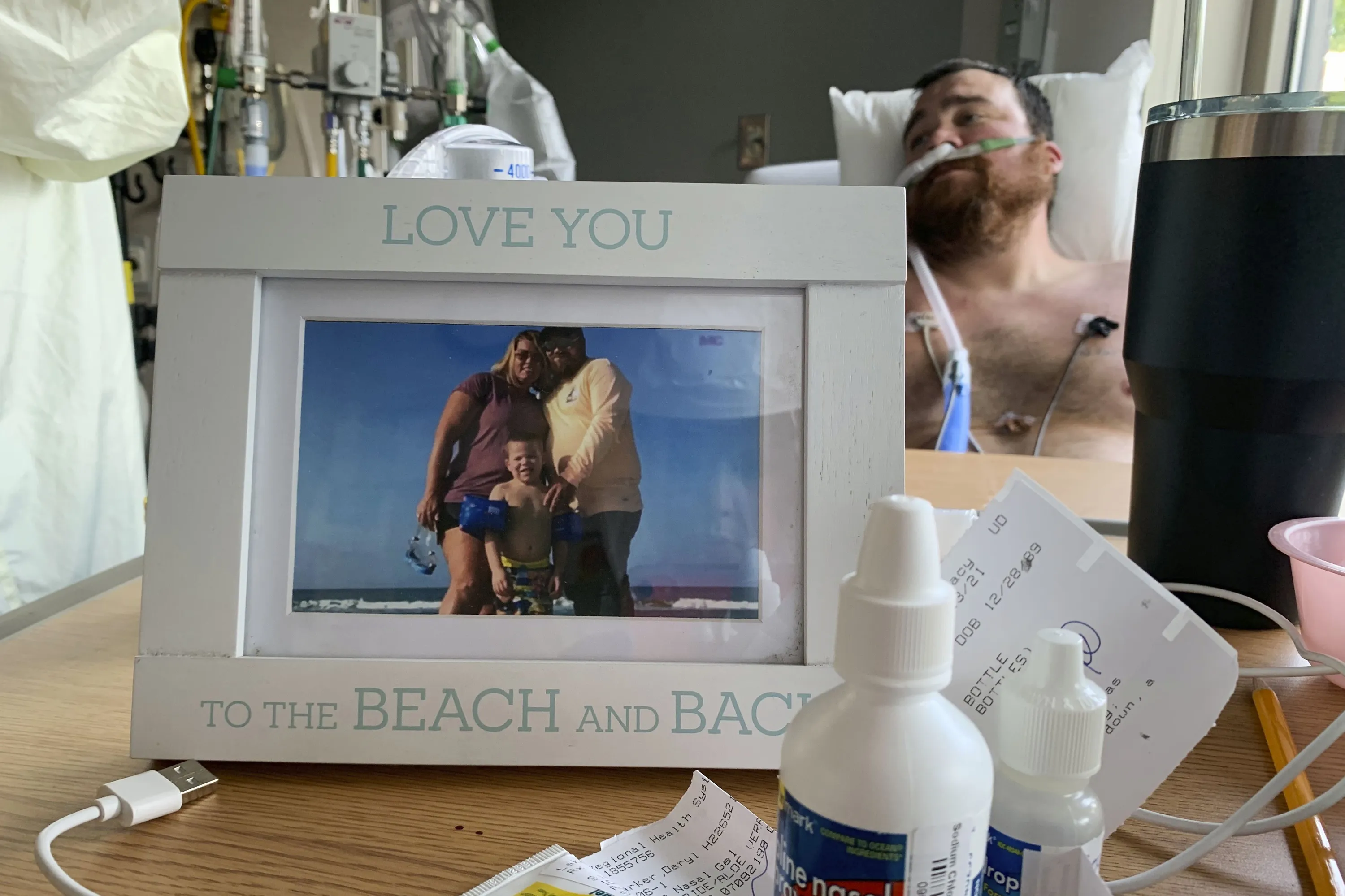 A framed photo of his family sits in front of Daryl Barker as he slowly recovers from COVID-19 inside Lake Regional Hospital's ICU in Osage Beach, Mo., on Monday, July 26, 20021. Barker had chosen not to be vaccinated against the virus but his long hospitalization has forced him to reconsider. (Photo by Sarah Blake Morgan/AP Photo)
