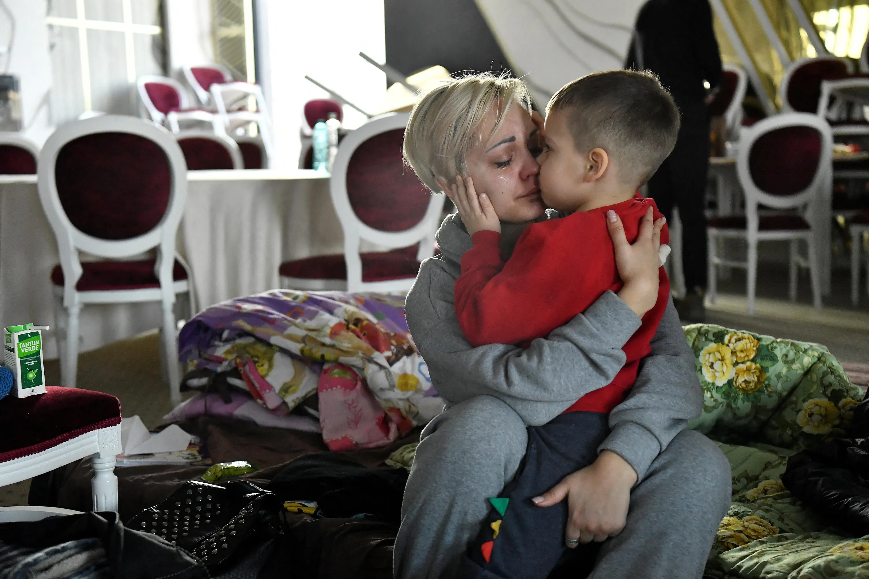 Egor, 5, comforts his mother Helen Yakubets who cries in a ballroom, which has been converted to a temporary shelter, at the Mandachi hotel after fleeing from Chernihiv in Ukraine to Romania, following Russia's invasion of Ukraine, at the border crossing in Suceava, Romania, March 20, 2022. Her 18 year old son and husband remain in Ukraine to fight. (Photo by Clodagh Kilcoyne/Reuters)
