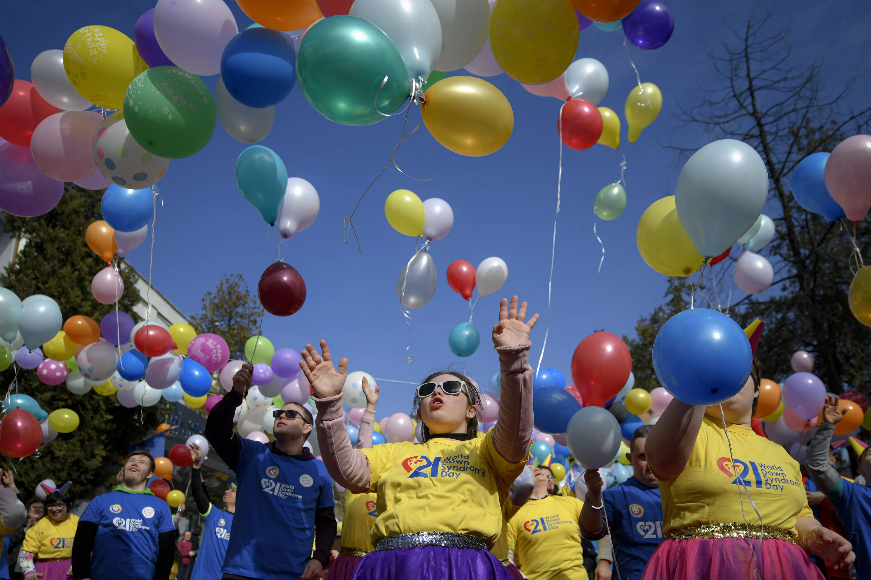 Young people with Down syndrome release colourful balloons during celebrations marking World Down Syndrome Day in Bucharest, Romania, Monday, March 21, 2022. Spirits were sky high on World Down Syndrome Day as up to 100 kids, teenagers and adults with the syndrome gathered to celebrate the event in the courtyard of a venue in the Romanian capital Bucharest. (Photo by Andreea Alexandru/AP Photo)