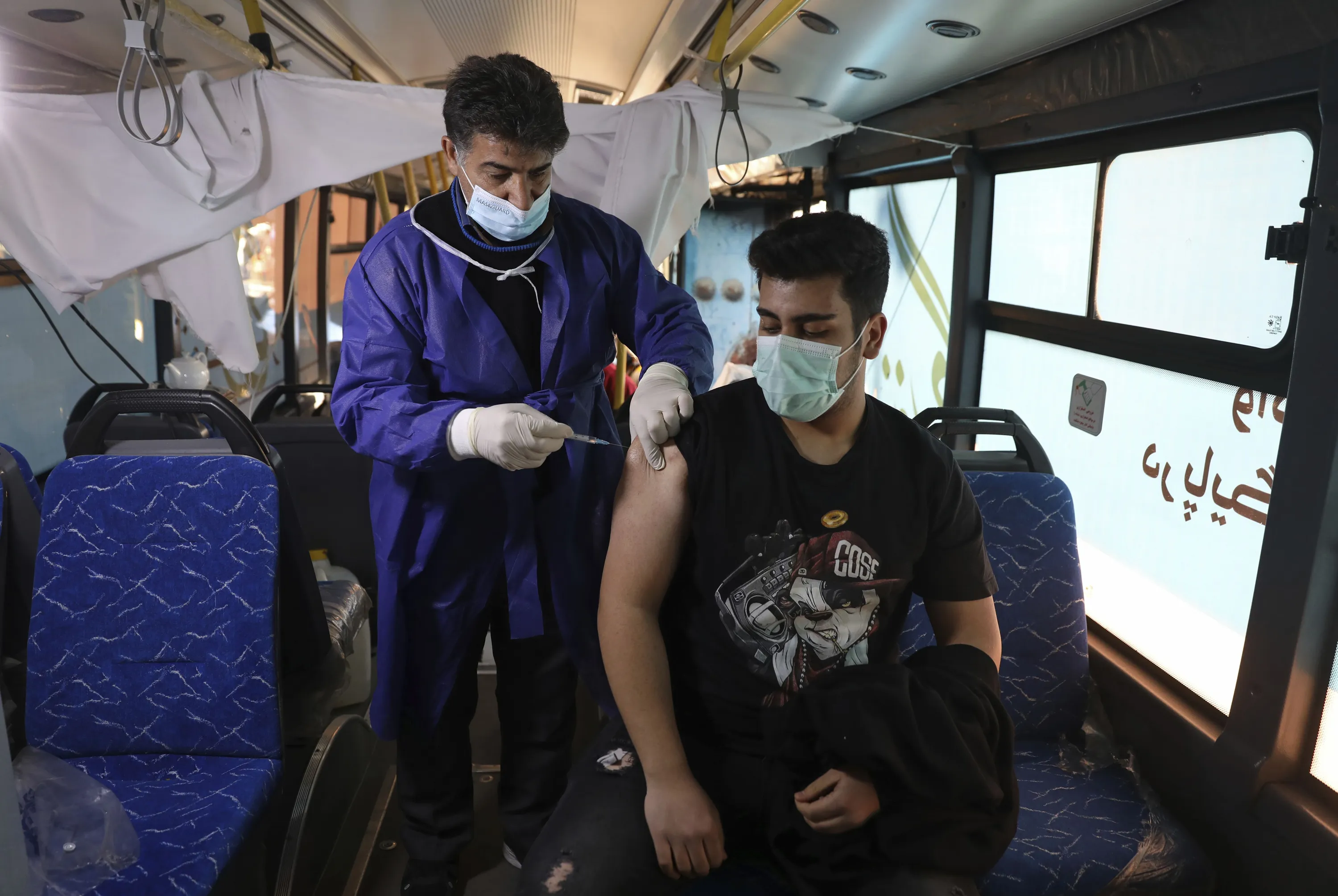 A man receives a COVID-19 vaccine at a mobile vaccine clinic bus at the Grand Bazaar of Tehran, Iran, Saturday, January 22, 2022. After successive virus waves pummeled the country for nearly two years, belated mass vaccination under a new, hard-line president has, for a brief moment, left the stricken nation with a feeling of apparent safety. (Photo by Vahid Salemi/AP Photo)