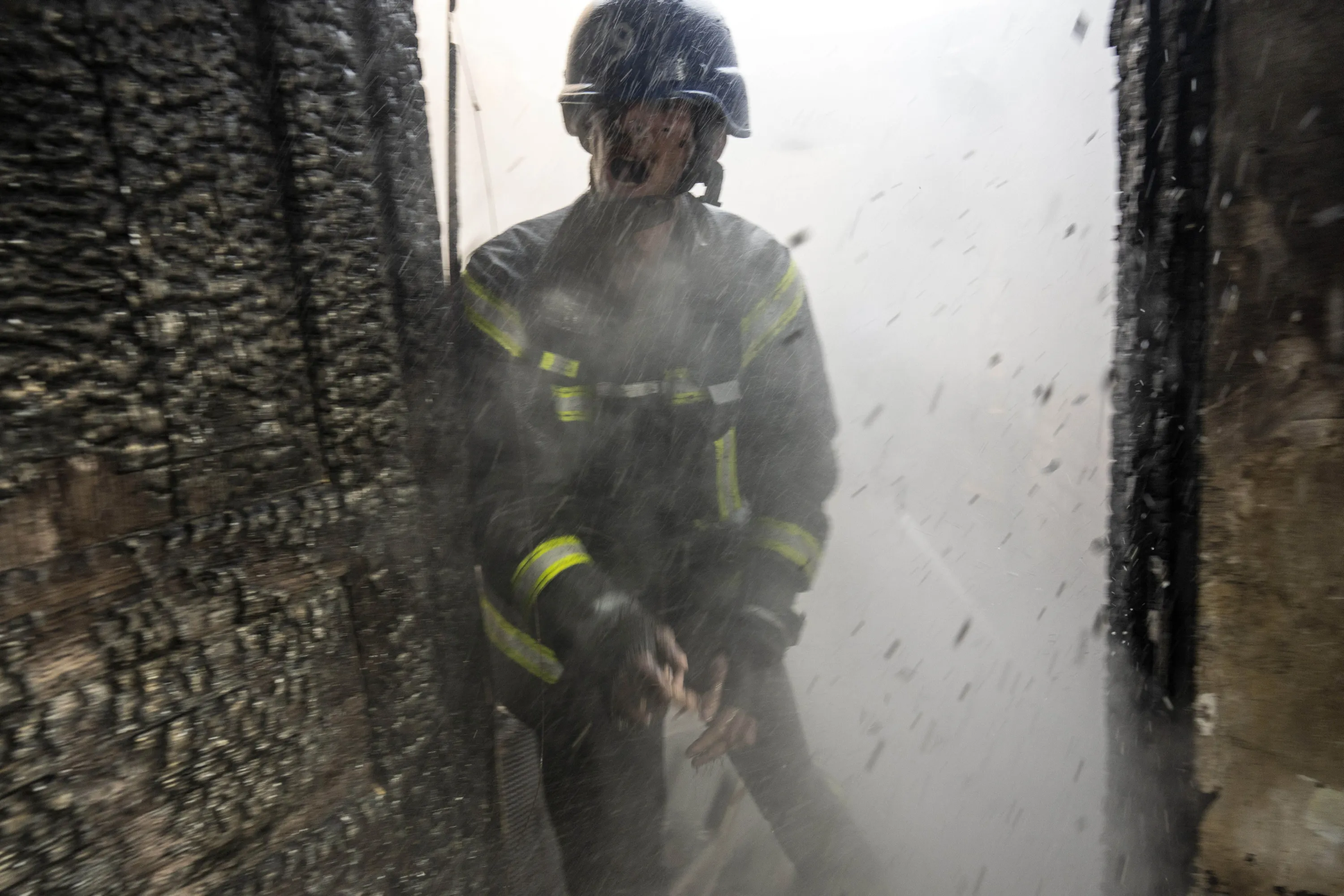A Ukrainian firefighter shouts to a colleague while trying to extinguish a fire inside a house destroyed by shelling in Kyiv, Ukraine,Wednesday, March 23, 2022. (Photo by Rodrigo Abd/AP Photo)