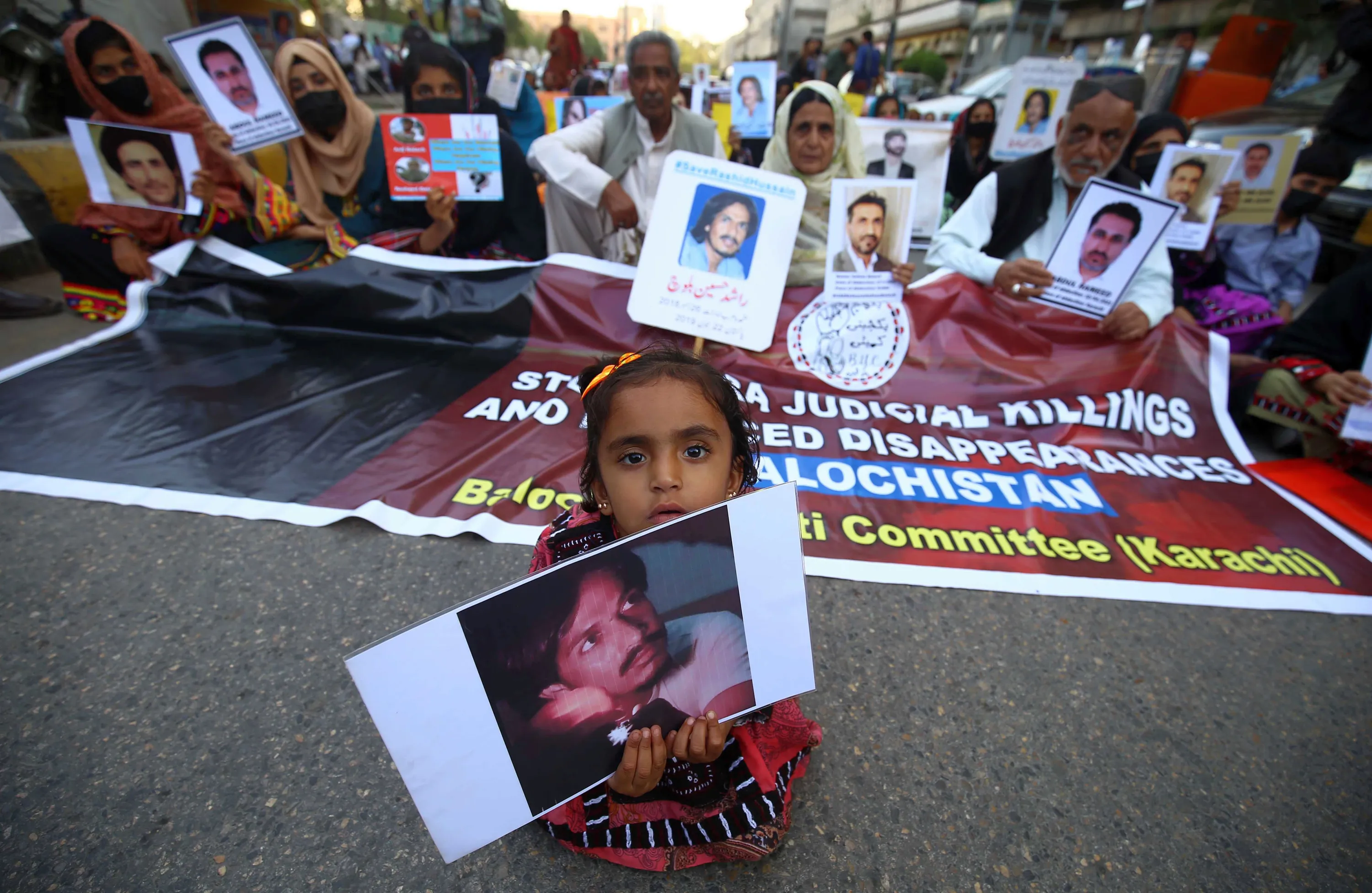 Family members hold pictures of their missing relatives during a protest demanding the deliverance of their relatives, in Karachi, Pakistan, 16 feburay 2022. People demanded the deliverance of their missing relatives whom Pakistani human rights activists claim have been picked up by state agencies, primarily under the pretext of fighting terrorism. (Photo by Shahzaib Akber//EPA/EFE)