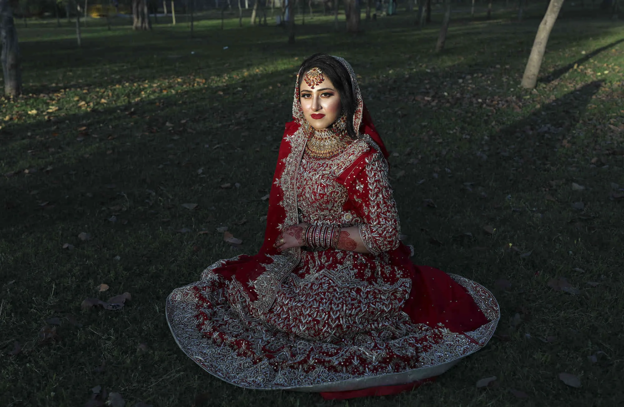 Hafiz Mohammad Awais, bride, poses for photograph, during her wedding ceremony in the park in Rawalpindi, Islamabad, Pakistan, Thursday, March 17, 2022. (Photo by Rahmat Gul/AP Photo)