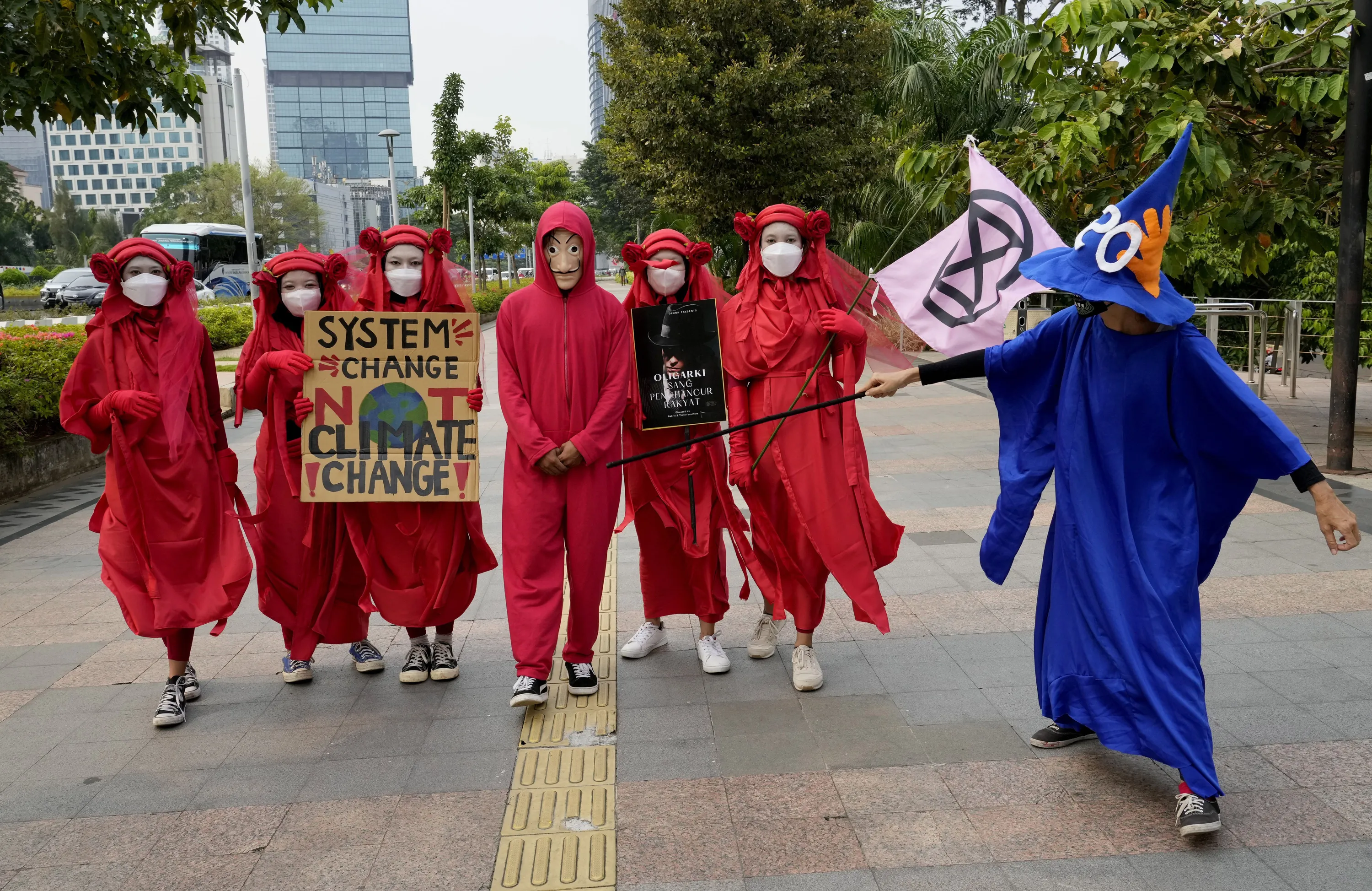 Environmental activists hold up posters during a protest calling for the government to take immediate action against climate change in Jakarta, Indonesia, Friday, March 25, 2022. (Photo by Tatan Syuflana/AP Photo)