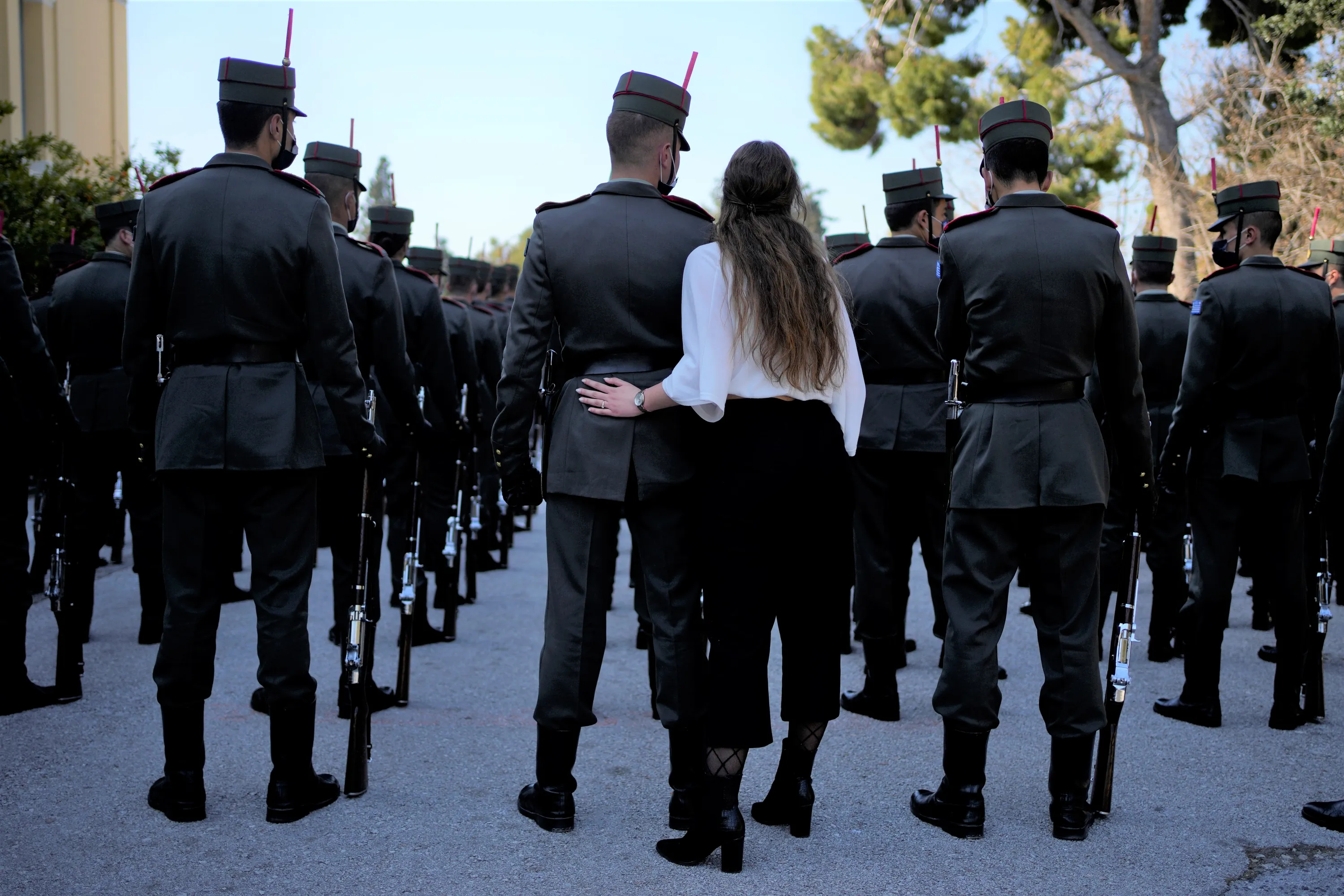 A girl hugs his brother before the military parade commemorating Greek Independence Day in Athens, Greece, Friday, March 25, 2022. The national holiday on March 25 marks the start of Greece's 1821 war of independence against the 400-year Ottoman rule. Greece signed agreements Thursday with France and two French contractors worth some 4 billion euros ($4.4 billion) to purchase three navy frigates and six additional Rafale fighter jets, as Athens continues to strengthen its armed forces in response to tension with neighbor Turkey. (Photo by Thanassis Stavrakis/AP Photo)