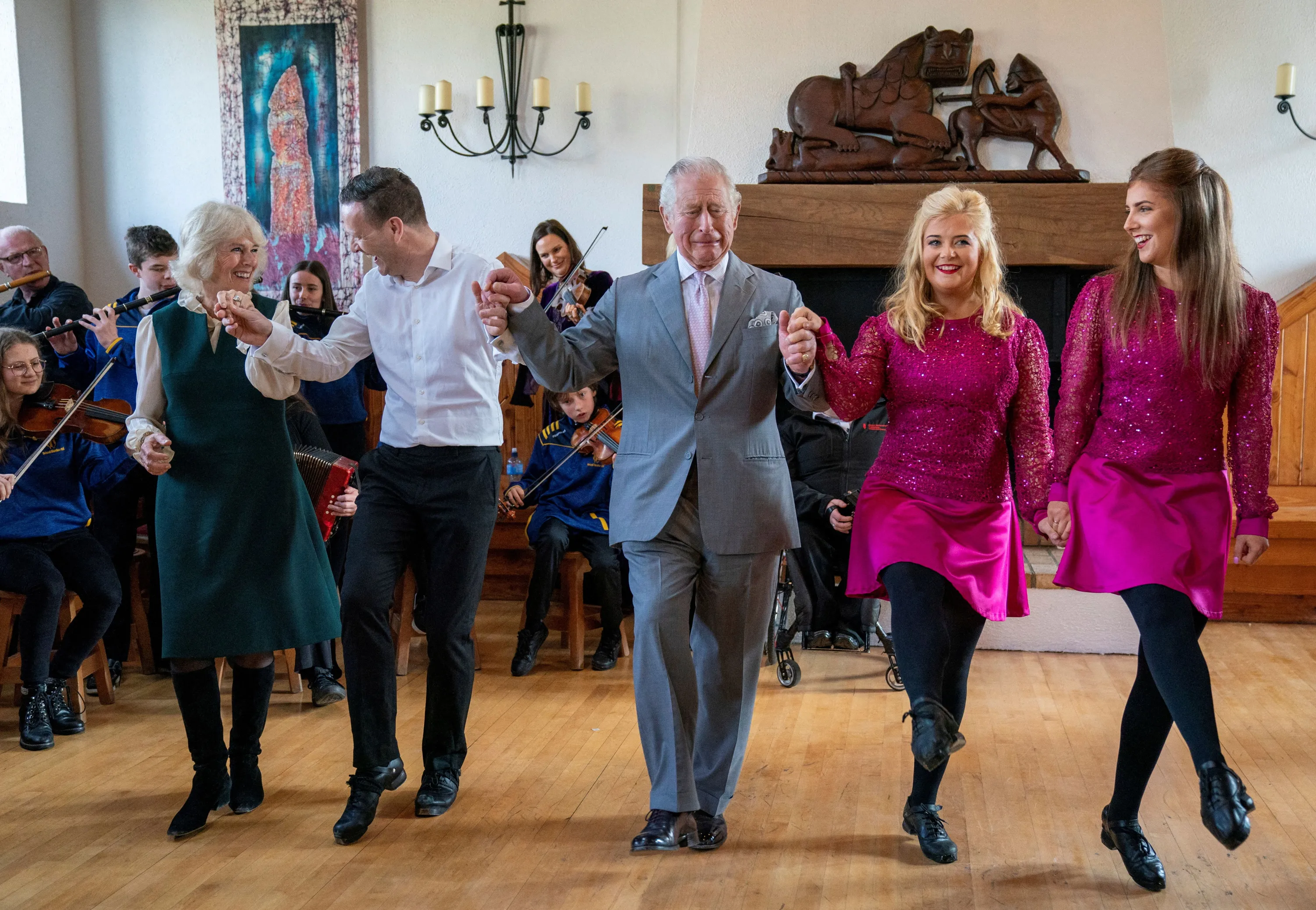 Britain's Prince Charles and Camilla, Duchess of Cornwall join in with the dancers during their visit at the Bru Boru Cultural Centre in Cashel, County Tipperary, Ireland on March 25, 2022. (Photo by Arthur Edwards/Pool via Reuters)