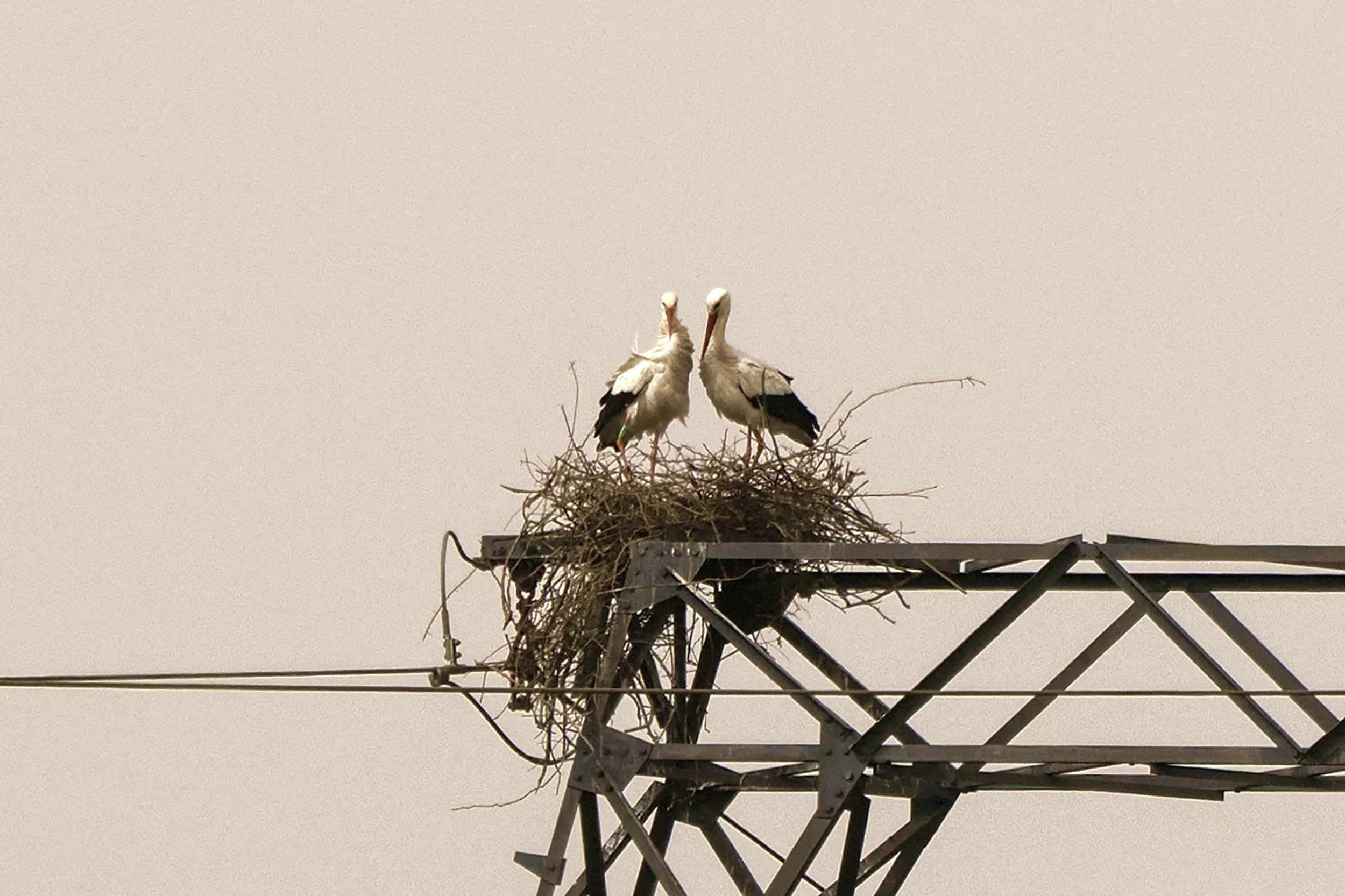 This photograph taken in Nantes, western France, on March 15, 2022, shows a couple of storkes in their nest set on an electricity pylon under a yellow ochre sky caused by Saharan dust. (Photo by Loic Venance/AFP Photo)