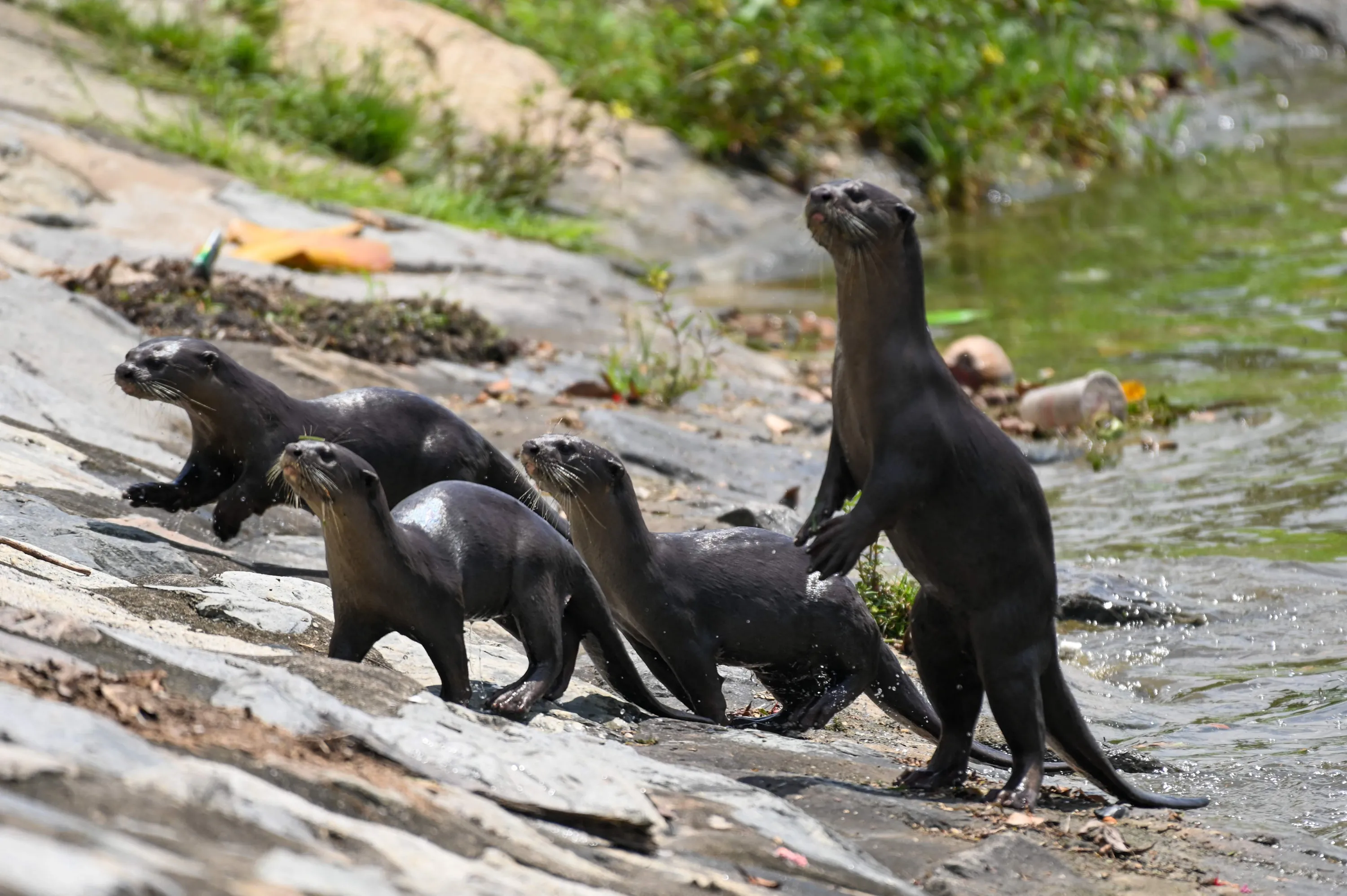 A group of smooth-coated otters climbs up along the banks of the Kallang River in Singapore on March 16, 2022. (Photo by Roslan Rahman/AFP Photo)